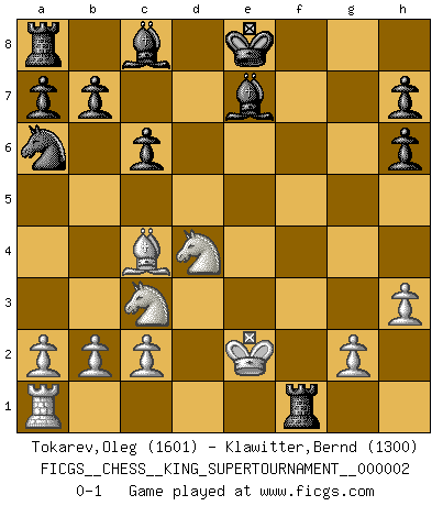 Last move : 0-1 2018 June 22 15:50:17 [Event "FICGS__CHESS__KING_SUPERTOURNAMENT__000002"] [Site "FICGS"] [Date "2018.05.01"] [Round "1"] [White "Tokarev,Oleg"] [Black "Klawitter,Bernd"] [Result "0-1"] [WhiteElo "1601"] [BlackElo "1300"] 1.e4 e5 2.f4 exf4 3.Bc4 Qh4+ 4.Kf1 d5 5.Nf3 Qg4 6.Bxd5 Nh6 7.d4 c6 8.Bc4 Be7 9.h3 Qd7 10.Bxf4 f6 11.Bxh6 gxh6 12.e5 fxe5 13.Nc3 exd4 14.Qxd4 Qxd4 15.Nxd4 Rf8+ 16.Ke2 Na6 17.Rhf1 Rxf1 0-1 This chess game has been lost on time (started : 2018.05.01 22:10:15) KGA : Bishop's gambit Player Black won this chess game. Follow this game move after move (download)One doesn't have to play well, it's enough to play better than your opponent. (Siegbert Tarrasch) Sie bekommen vielleicht den Eindruck, dass die Spitzenspieler überhaupt gar nicht so stark sind. Aber das stimmt nicht. Es ist eine Illusion. Mit einem Computer an der Seite ist es sehr leicht, Urteile zu fällen, aber wenn man alleine am Brett sitzt, sieht die Sache ganz anders aus. (Vladimir Kramnik) Bobby Fischer es el jugador de Ajedrez mas grande que jamás haya existido. (Ken Smith) La conception d'un plan est le processus par lequel un joueur exploite les avantages de sa position tout en s'efforçant d'en réduire au minimum les inconvénients. Afin de garantir le succès, un plan doit toujours se fonder sur un diagnostic objectif des particularités d'une position. La conception d'un plan est d'autant plus difficile que la position est équilibrée, et grandement facilitée lorsqu'il n'existe qu'un seul plan susceptible de répondre aux exigences de la position. (Harry Golombek) Hardware: the parts of a computer that can be kicked. (Jeff Persis)