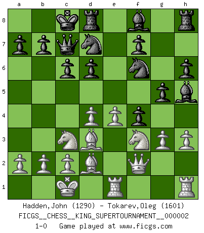 Last move : 1-0 2018 July 1 17:21:36 [Event "FICGS__CHESS__KING_SUPERTOURNAMENT__000002"] [Site "FICGS"] [Date "2018.05.01"] [Round "1"] [White "Hadden,John"] [Black "Tokarev,Oleg"] [Result "1-0"] [WhiteElo "1290"] [BlackElo "1601"] 1.e4 e5 2.f4 exf4 3.Nf3 d6 4.Nc3 Nf6 5.d4 g5 6.Bd3 Bg4 7.h3 Bh5 8.Qd2 h6 9.Qf2 Nbd7 10.Bd2 c6 11.O-O-O Qc7 12.Rde1 O-O-O 13.g3 1-0 This chess game has been lost on time (started : 2018.05.01 22:10:15) KGA : Fischer defense Queenside Castling by player White (move 11) Queenside Castling by player Black (move 12) Player White won this chess game. Follow this game move after move (download)A man that will take back a move at Chess will pick a pocket. (Richard Fenton) Wenn ich Weiß habe gewinne ich weil ich Weiß habe, wenn ich Schwarz habe gewinne ich weil ich Bogoljubov bin. (Efim Bogoljubov) Fischer sacrificó virtualmente todo lo que la mayorÃa de nosotros los 'debiles' (término que él usa) valoramos, respetamos y apreciamos por el amor de un astuto, a menudo hermoso tablero de juego, por el privilegio ambivalente de ser su mas grande maestro. (Paul Kollar) Vous m'avez demandé de vous exposer quel est le fondement de la prière. Je ne fais que préparer les pièces du jeu sur la table... Nous sera-t-il permis d'en adopter les règles et si nous les appliquons scrupuleusement nous ne tarderons pas à faire mat le Roi divin ! Il ne pourra échapper à nos mains. (Sainte Thérèse d'Avila, Chemin de perfection) Empty your mind, be formless, shapeless — like water. (Bruce Lee)