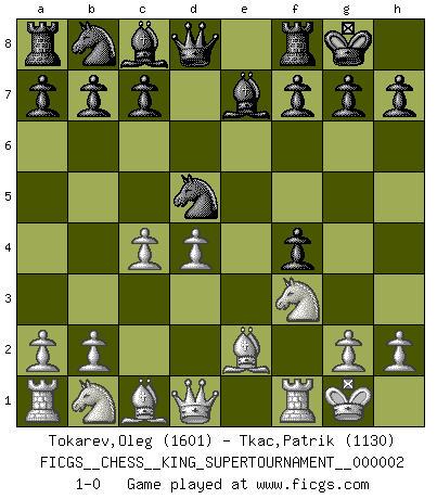 Last move : 1-0 2018 June 21 3:28:39 [Event "FICGS__CHESS__KING_SUPERTOURNAMENT__000002"] [Site "FICGS"] [Date "2018.05.01"] [Round "1"] [White "Tokarev,Oleg"] [Black "Tkac,Patrik"] [Result "1-0"] [WhiteElo "1601"] [BlackElo "1130"] 1.e4 e5 2.f4 exf4 3.Nf3 Ne7 4.d4 d5 5.exd5 Nxd5 6.Be2 Be7 7.O-O O-O 8.c4 1-0 This chess game has been lost on time (started : 2018.05.01 22:10:15) KGA : Bonsch-Osmolovsky variation Kingside Castling by player White (move 7) Kingside Castling by player Black (move 7) Player White won this chess game. Follow this game move after move (download)Via the squares on the chessboard, the Indians explain the movement of time and the age, the higher influences which control the world and the ties which link Chess with the human soul. (Al-Masudi) Ich hatte Zahnschmerzen im ersten Spiel. In der zweiten Partie tat mir der Kopf weh. In der dritten war es eine Rheuma-Attacke und während der vierten fühlte ich mich nicht gut. Und in der fünften? Nun, man muss doch nicht jedes Spiel gewinnen, oder? (Savielly Grigorievitsch Tartakower) Aún el Rey más flojo huye despavorido ante la amenaza de un Jaque doble. (Aaron Nimzowitsch) Les Echecs représentent une sphère d'idées créatrices basée sur la volonté des deux protagonistes. (Smyslov) A generalist learns less and less about more and more until he knows nothing about everything. (Author unknown)