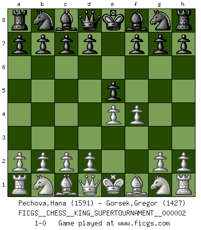 Last move : 1-0 2018 June 1 0:38:7 [Event "FICGS__CHESS__KING_SUPERTOURNAMENT__000002"] [Site "FICGS"] [Date "2018.05.01"] [Round "1"] [White "Pechova,Hana"] [Black "Gorsek,Gregor"] [Result "1-0"] [WhiteElo "1591"] [BlackElo "1427"] 1.e4 e5 2.f4 1-0 This chess game has been lost on time (started : 2018.05.01 22:10:15) King's gambit Player White won this chess game. Follow this game move after move (download)The Pin is mightier than the sword. (Fred Reinfeld) Fischer ist das größte Genie, das je vom Schachhimmel heruntergestiegen ist. (Mikhail Nekhemyevich Tal) El Ajedrez es una manera fabulosa para que los niños aprendan a autovalorarse y a autoestimarse. (Saudin Robovic) Je crois qu'il existe des manières très spécifiques de jouer efficacement contre une machine. Evidemment, nous n'avons aucune chance en technique pure, parce que l'ordinateur calcule de manière parfaite. Mais lorsque nous faisons appel à notre cerveau, en utilisant l'intuition et la compréhension, alors nous restons beaucoup plus forts. (Anatoli Karpov) The best teachers teach from the heart, not from the book. (Author unknown)