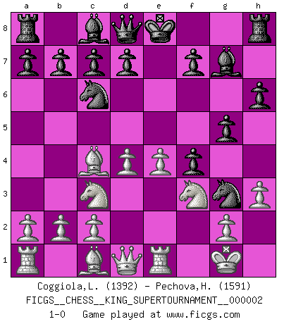Last move : 1-0 2018 June 19 15:20:59 [Event "FICGS__CHESS__KING_SUPERTOURNAMENT__000002"] [Site "FICGS"] [Date "2018.05.01"] [Round "1"] [White "Coggiola,Leandro Damian"] [Black "Pechova,Hana"] [Result "1-0"] [WhiteElo "1392"] [BlackElo "1591"] 1.e4 e5 2.f4 exf4 3.Nf3 g5 4.h3 h6 5.Be2 Nf6 6.Nc3 Nh5 7.O-O Ng3 8.Re1 Nc6 9.d4 Bg7 10.Bc4 1-0 This chess game has been lost on time (started : 2018.05.01 22:10:15) King's knight's gambit Kingside Castling by player White (move 7) Player White won this chess game. Follow this game move after move (download)First-class players lose to second-class players because second-class players sometimes play a first-class game. (Siegbert Tarrasch) Jede Eröffnung ist gut genug um gespielt zu werden, wenn nur ihr Ruf schlecht genug ist. (Savielly Grigorievitsch Tartakower) Hay dos clases de hombres: aquellos que se conforman en dejarse llevar por las circunstancias y que juegan barajas y aquellos decididos a controlar las circunstancias y que juegan al Ajedrez. (Mortimer Collins) Je ne suis pas le dernier à jouer lâchement des coups douteux pendant le zeïtnot de l'adversaire pour l'achever: en effet les coups qui font le plus peur sont ceux que l'on ne comprend pas. Je me fais souvent peur quand je joue. (Un professeur anonyme) Every now and then a man's mind is stretched by a new idea and never shrinks back to its former dimensions. (Oliver Wendell Holmes, Sr.)