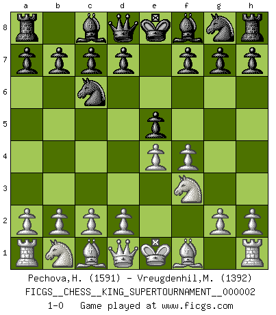 Last move : 1-0 2018 June 13 14:44:4 [Event "FICGS__CHESS__KING_SUPERTOURNAMENT__000002"] [Site "FICGS"] [Date "2018.05.01"] [Round "1"] [White "Pechova,Hana"] [Black "Vreugdenhil,Maarten"] [Result "1-0"] [WhiteElo "1591"] [BlackElo "1392"] 1.e4 e5 2.f4 Nc6 3.Nf3 1-0 This chess game has been lost on time (started : 2018.05.01 22:10:15) King's gambit Player White won this chess game. Follow this game move after move (download)I know people who have all the will in the world, but still can't play good Chess. (Bobby Fischer) Ich bin der einzige Schachspieler, der sich während der Vorbereitungen zum Turnier verletzt hat. (Woody Allen) Una clavada es mas poderosa que una espada. (Fred Reinfeld) Le succès, c'est être capable d'aller d'échec en échec sans perdre son enthousiasme. (Winston Churchill) Good decisions come from experience, and experience comes from bad decisions. (Anonymous)