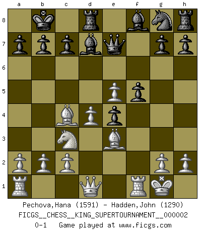 Last move : 0-1 2018 June 22 15:50:17 [Event "FICGS__CHESS__KING_SUPERTOURNAMENT__000002"] [Site "FICGS"] [Date "2018.05.01"] [Round "1"] [White "Pechova,Hana"] [Black "Hadden,John"] [Result "0-1"] [WhiteElo "1591"] [BlackElo "1290"] 1.e4 e5 2.f4 d5 3.Nf3 dxe4 4.Nxe5 Nd7 5.d4 Nxe5 6.fxe5 f5 7.Bc4 Bd7 8.O-O Qe7 9.Nc3 O-O-O 10.Be3 Kb8 0-1 This chess game has been lost on time (started : 2018.05.01 22:10:15) KGD : Falkbeer, Tartakower variation Kingside Castling by player White (move 8) Queenside Castling by player Black (move 9) Player Black won this chess game. Follow this game move after move (download)The essence of Chess is thinking about what Chess is. (David Bronstein) Obendrein hat der FIDE-Präsident den Revolutionsführer Gaddafi zum »Großmeister« ernannt, am Ende der WM. Das ist lächerlich! (Joel Lautier) El Ajedrez por encima de todo... ¡es una pelea!. (Emanuel Lasker) On est toujours la mazette de quelqu'un d'autre. (Anonyme) Even the best needles are not sharp at both ends. (Chinese proverb)
