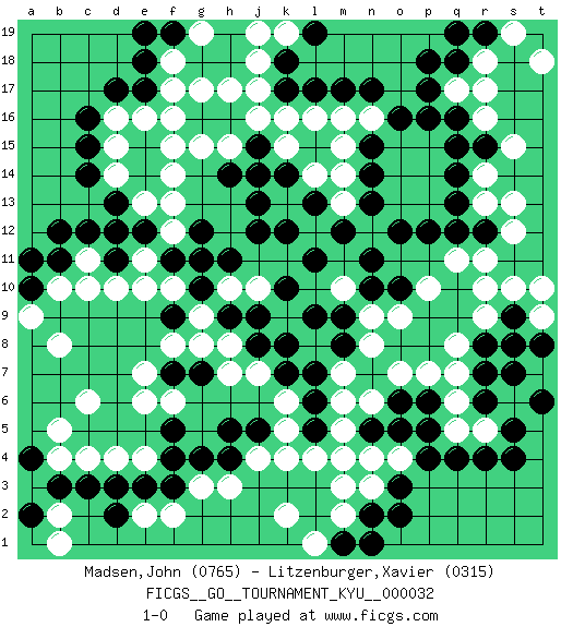 Last move : 1-0 2007 August 2 19:54:32 [Event "FICGS__GO__TOURNAMENT_KYU__000032"] [Site "FICGS"] [Date "2007.05.04"] [Round "1"] [Black "Madsen,John"] [White "Litzenburger,Xavier"] [Result "1-0"] [Rating 1 "0765"] [Rating 2 "0315"] 1.q4 d4 2.d17 r16 3.p17 q17 4.p16 r14 5.m17 f17 6.c15 j17 7.f3 h3 8.f5 c6 9.c3 c4 10.d3 c10 11.c12 m3 12.r7 r10 13.o3 m5 14.h4 j4 15.h5 e6 16.j5 k4 17.r12 p10 18.p12 r5 19.r4 q6 20.s5 q7 21.r8 q8 22.q13 f15 23.g7 m10 24.k7 g3 25.g4 m7 26.l15 s6 27.r6 q5 28.s4 r9 29.s7 m14 30.m12 n12 31.n13 m13 32.n14 l12 33.o12 m15 34.n15 n16 35.o16 m16 36.n17 l16 37.n11 f12 38.j12 j10 39.h11 h10 40.g11 e10 41.g10 g9 42.f9 f10 43.h9 g8 44.j9 h7 45.k10 h8 46.f7 f8 47.j8 e7 48.j14 j7 49.k8 k6 50.l9 f6 51.m9 n9 52.n10 o9 53.l11 k13 54.j13 k15 55.j15 j16 56.k14 l14 57.k12 e4 58.f4 e2 59.e3 f2 60.d2 b2 61.b3 b4 62.a4 b5 63.a2 b1 64.h16 h17 65.g16 g17 66.n2 m2 67.o5 n6 68.e18 f18 69.d11 d10 70.f11 e11 71.e12 e13 72.d12 f14 73.b11 b10 74.d13 d16 75.c16 d14 76.c14 d15 77.a10 a9 78.a11 b8 79.q18 r18 80.q16 r17 81.p18 s13 82.k18 j18 83.k17 k16 84.l17 s12 85.s9 s10 86.o6 o7 87.m8 n8 88.n5 m4 89.m1 l1 90.n1 k2 91.e17 f16 92.g12 f13 93.l13 h15 94.h14 g15 95.r19 s19 96.q19 t18 97.q14 n3 98.o2 o4 99.p4 n4 100.p5 t9 101.s8 r11 102.r15 s15 103.q15 r13 104.q12 q11 105.f19 g19 106.e19 k19 107.l19 j19 108.l6 k5 109.l7 m6 110.l5 l4 111.p6 p7 112.t6 c11 113.b12 e16 114.t8 t10 115.o10 1-0 Here are the names of the openings (joseki) played in the four corners : Corner q16 : r16 p17 Komoku (Somok, Xiao~mu`) 3-4 Point. The komoku (3-4) point is the traditional corner enclosure move.. Ikken Kakari (Hankan Keolch'im, Yi Gua`jiao~, 1-Space Low Pincer). The small knight move is the basic approach move to the 3-4 point stone. It has been continually used for over four centuries. There are limitless variations, with new moves constantly being discovered. Black 2 opens the door to a treaure store of joseki. Corner d16 : d17 f17 Komoku (Somok, Xiao~mu`) 3-4 Point. The komoku (3-4) point is the traditional corner enclosure move.. Corner d4 : d4 f3 Hoshi (Hwajeom, Seongjeom, Xingwei`) 4-4 Point. The star or hoshi (4-4) point, emphasizing influence at the potential expense of territory. Ikken Kakari (Hankan Keolch'im, Yi Gua`jiao~, 1-Space Low Approach). Black 2 is the standard approach move to the 4-4. Corner q4 : q4 m3 Hoshi (Hwajeom, Seongjeom, Xingwei`) 4-4 Point. The star or hoshi (4-4) point, emphasizing influence at the potential expense of territory. Player Black won this Go (weiqi, baduk) game. Follow this game move after move (download)Never try to cut bamboo joints. (Anonymous) Don't be discouraged. It's often the last key in the bunch that opens the lock. (Author unknown)