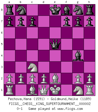 Last move : 0-1 2018 June 14 5:45:54 [Event "FICGS__CHESS__KING_SUPERTOURNAMENT__000002"] [Site "FICGS"] [Date "2018.05.01"] [Round "1"] [White "Pechova,Hana"] [Black "Goldmund,Heike"] [Result "0-1"] [WhiteElo "1591"] [BlackElo "1189"] 1.e4 e5 2.f4 d5 3.exd5 Qxd5 4.Nc3 Qd6 5.fxe5 Qxe5+ 6.Be2 Bg4 0-1 KGD : Falkbeer counter-gambit Player Black won this chess game. Follow this game move after move (download)Weak points or holes in the opponent's position must be occupied by pieces not Pawns. (Siegbert Tarrasch) Bogoljubow: Matt in vier Zügen! Tartakower: Ich verbitte mir jede Belästigung! (Savielly Grigorievitsch Tartakower) Un jugador que trata de regresar una movida en el Ajedrez es un futuro carterista. (Richard Fenton) On peut tirer plus d'utilité d'une partie perdue que de 100 parties gagnées. (Capablanca) Humor is by far the most significant activity of the human brain. (Edward De Bono)