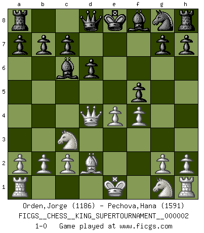 Last move : 1-0 2018 June 14 1:20:53 [Event "FICGS__CHESS__KING_SUPERTOURNAMENT__000002"] [Site "FICGS"] [Date "2018.05.01"] [Round "1"] [White "Orden,Jorge"] [Black "Pechova,Hana"] [Result "1-0"] [WhiteElo "1186"] [BlackElo "1591"] 1.e4 e5 2.f4 d6 3.d4 exd4 4.Qxd4 Nc6 5.Bb5 Bd7 6.Bxc6 Bxc6 7.Nc3 f5 8.Bd2 1-0 King's gambit Player White won this chess game. Follow this game move after move (download)You know, comrade Pachman, I don't enjoy being a Minister, I would rather play Chess like you. (Che Guevara) Nach Morphy wurde nichts neues mehr in der Behandlung offener Positionen gefunden. (Mikhail Moiseyevich Botvinik) El Ajedrez es un expediente tonto que hace creer a la gente inactiva que hacen una cosa muy astuta cuando solamente estan perdiendo su tiempo. (George Bernard Shaw) Il s'avisa de me proposer d'apprendre les échecs qu'il jouait un peu... me voilà forcené des échecs. J'achète un échiquier, je m'enferme dans ma chambre, j'y passe des jours et des nuits à vouloir apprendre par cur toutes les parties. (Jean-Jacques Rousseau, Confessions) It's only after you lost everything, Tyler says, that you're free to do anything. (Chuck Palahniuk, Fight Club)