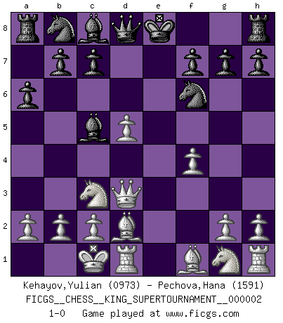 Last move : 1-0 2018 July 1 17:21:36 [Event "FICGS__CHESS__KING_SUPERTOURNAMENT__000002"] [Site "FICGS"] [Date "2018.05.01"] [Round "1"] [White "Kehayov,Yulian"] [Black "Pechova,Hana"] [Result "1-0"] [WhiteElo "0973"] [BlackElo "1591"] 1.e4 e5 2.f4 d5 3.exd5 e4 4.d4 exd3 5.Qxd3 Nf6 6.Nc3 a6 7.Bd2 Bc5 8.O-O-O 1-0 This chess game has been lost on time (started : 2018.05.01 22:10:15) KGD : Falkbeer, 3...e4 Queenside Castling by player White (move 8) Player White won this chess game. Follow this game move after move (download)Chess is a forcing house where the fruits of character can ripen more fully than in life. (Edward Morgan Foster) Ein Schachgenie ist jemand der verdammt gut Schach spielt. (Jonathan Levitt) Hoy en día, si tu no eres un Gran Maestro a los 14 años, es mejor que lo olvides. (Anand Viswanathan) Le pion, dans sa simplicité, marche droit devant lui, mais lorsqu'il prend, il le fait obliquement? Ainsi l'homme, tant qu'il reste pauvre, marche dans la droiture et vit honnêtement, mais lorsqu'il recherche les honneurs, il flatte, se parjure et, par les voies obliques, cherche une position supérieure sur l'échiquier du monde. (Jean de Galles) I'm extremely disappointed. I send you out for exciting, new designer drugs, you come back with tomato sauce. (Gregory House, House M.D.)