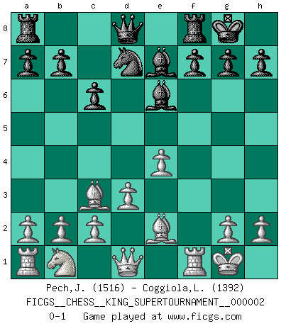 Last move : 0-1 2018 June 19 3:14:42 [Event "FICGS__CHESS__KING_SUPERTOURNAMENT__000002"] [Site "FICGS"] [Date "2018.05.01"] [Round "1"] [White "Pech,Jaroslav"] [Black "Coggiola,Leandro Damian"] [Result "0-1"] [WhiteElo "1516"] [BlackElo "1392"] 1.e4 e5 2.f4 d6 3.d3 Nf6 4.Nf3 Be7 5.fxe5 dxe5 6.Nxe5 O-O 7.Be2 Be6 8.Bf4 Nbd7 9.O-O Nxe5 10.Bxe5 Nd7 11.Bc3 c6 0-1 This chess game has been lost on time (started : 2018.05.01 22:10:15) King's gambit Kingside Castling by player Black (move 6) Kingside Castling by player White (move 9) Player Black won this chess game. Follow this game move after move (download)You have to have the fighting spirit. You have to force moves and take chances. (Bobby Fischer) Die größte Kunst beim Schach besteht darin dem Gegner nicht zu zeigen was er tun kann. (Garry Kasparov) No nos podemos resistir a la fascinación de un sacrificio ya que la pasión por los sacrificios es parte de la naturaleza de un jugador de Ajedrez. (Rudolf Spielman) Botvinnik disait en comparant les échecs à la musique: Il existe une science dont le but est l'étude de l'acoustique et des sons. Mais il y a aussi un art qui se sert de l'océan des sons : c'est la musique. De toute évidence, il en est de même pour la pensée. La logique est l'étude des lois de la réflexion et les échecs reflètent, en tant qu'art, le côté logique de la réflexion, sous la forme d'images artistiques... Extrait de Fischer - Spassky, Reykjavik 1972 par Alexander & F. Wyndham (Ed. Solar), p 37. Some people are so afraid to die that they never begin to live. (Henry Van Dyke)