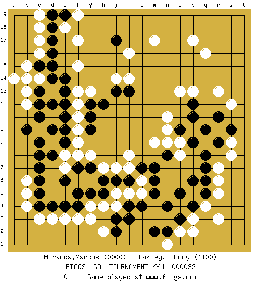 Last move : 0-1 2007 May 22 19:40:38 [Event "FICGS__GO__TOURNAMENT_KYU__000032"] [Site "FICGS"] [Date "2007.05.04"] [Round "1"] [Black "Miranda,Marcus"] [White "Oakley,Johnny"] [Result "0-1"] [Rating 1 "0000"] [Rating 2 "1100"] 1.d4 q16 2.d16 q4 3.c11 f17 4.j17 c17 5.d17 c16 6.c15 b15 7.b14 c14 8.d15 b13 9.k3 a14 10.q10 f15 11.e14 g13 12.e12 m17 13.n4 r6 14.q8 r13 15.p6 k16 16.c8 j4 17.g12 f13 18.e13 f12 19.h12 f11 20.g11 f10 21.g10 c3 22.c4 d3 23.e4 e3 24.f4 g3 25.j2 h2 26.j3 b4 27.c5 b5 28.c6 p3 29.o3 p17 30.r11 j14 31.p12 p13 32.j13 k14 33.k13 g4 34.g5 h4 35.h5 k5 36.k6 l5 37.m5 l6 38.k4 j5 39.l4 e18 40.d18 c18 41.d19 c19 42.e19 f19 43.j6 f9 44.f5 o13 45.p11 o2 46.n2 p2 47.o5 h7 48.h6 d12 49.e11 d11 50.e10 d9 51.d10 c10 52.c12 d13 53.c13 b12 54.d14 b14 55.d12 s8 56.q7 n11 57.c9 g8 58.e9 k8 59.l7 k7 60.m6 m9 61.c7 e8 62.d8 e7 63.f7 f8 64.e6 b6 65.b10 n1 66.m2 s12 67.r9 s9 68.p4 r3 69.s10 r7 70.q5 r5 71.q6 f3 72.g7 j7 73.m7 o9 74.o10 n10 75.n8 n9 76.p9 o8 0-1 Here are the names of the openings (joseki) played in the four corners : Corner q4 : q4 n4 Hoshi (Hwajeom, Seongjeom, Xingwei`) 4-4 Point. The star or hoshi (4-4) point, emphasizing influence at the potential expense of territory. Nikken Takagakari (Dukan Nop'dakeolch'im, E`r Gaojia, 2-Space High Approach). Black 2 is a light approach move. Rarely played in even games, Black 2 is typically employed in handicap games. White continues with 6-4 or 3-10. In Korean Sunjang Baduk White has a stone on 8-4. Player White won this Go (weiqi, baduk) game. Follow this game move after move (download)Do not fear furikawari. (Anonymous) Industry executives and analysts often mistakenly talk about strategy as if it were some kind of chess match. But in chess, you have just two opponents, each with identical resources, and with luck playing a minimal role. The real world is much more like a poker game, with multiple players trying to make the best of whatever hand fortune has dealt them. In our industry, Bill Gates owns the table until someone proves otherwise. (David Moschella, 'Computerworld')