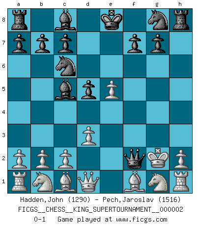 Last move : 0-1 2018 June 22 14:57:35 [Event "FICGS__CHESS__KING_SUPERTOURNAMENT__000002"] [Site "FICGS"] [Date "2018.05.01"] [Round "1"] [White "Hadden,John"] [Black "Pech,Jaroslav"] [Result "0-1"] [WhiteElo "1290"] [BlackElo "1516"] 1.e4 e5 2.f4 Nc6 3.fxe5 Qh4+ 4.Ke2 Qxe4+ 5.Kf2 Bc5+ 6.Kg3 h5 7.d3 h4+ 8.Kh3 d5 9.g4 hxg3 10.Kxg3 Qh4+ 11.Kg2 Qf2+ 0-1 King's gambit Player Black won this chess game. Follow this game move after move (download)The boy (then a 12 year old boy named Anatoly Karpov) doesn't have a clue about Chess, and there's no future at all for him in this profession. (Mikhail Botvinnik) Sitze auf Deine Hände. (Siegbert Tarrasch) El Ajedrez es en su esencia, un juego. En su forma, un arte. Y en su ejecución, una ciencia. (Baron Tassilo) Comme les marins qui ont mille raisons différentes d'aller en mer, les joueurs d'échecs en ont tout autant avant de s'installer devant une table et jouer... (Vincent Bertignac, philosophe) Wisdom doesn't necessarily come with age. Sometimes age just shows up all by itself. (Tom Wilson)
