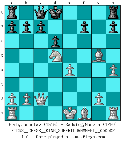 Last move : 1-0 2018 August 4 21:20:34 [Event "FICGS__CHESS__KING_SUPERTOURNAMENT__000002"] [Site "FICGS"] [Date "2018.05.01"] [Round "1"] [White "Pech,Jaroslav"] [Black "Radding,Marvin"] [Result "1-0"] [WhiteElo "1516"] [BlackElo "1250"] 1.e4 e5 2.f4 exf4 3.Nf3 Nc6 4.d4 g5 5.h4 g4 6.Ne5 Bh6 7.Nxg4 d6 8.Nxh6 Nxh6 9.Nc3 Bg4 10.Qd2 Qf6 11.Nd5 Qd8 12.Qxf4 Nxd4 13.Nf6+ Ke7 14.Qf2 Nxc2+ 15.Qxc2 Kf8 16.Bxh6+ Ke7 17.Bg5 Qc8 18.Nxg4 Kd7 19.Nf6+ Kd8 20.Nd5 1-0 This chess game has been lost on time (started : 2018.05.01 22:10:15) King's knight's gambit Player White won this chess game. Follow this game move after move (download)When you play Bobby, it is not a question if you win or lose. It is a question if you survive. (Boris Spassky) Wer wird heute Abend ihr Gegner sein? -- Heute Abend spiele ich gegen die schwarzen Steine. (Akiba Rubinstein) La caracteristica mas importante en la posición del Ajedrez es la actividad de las piezas. Esto es absolutamente fundamental en todas las fases del juego: Apertura, Juego Medio y especialmente Finales. La limitación primordial en la actividad de una pieza, es la estructuración de los Peones. (Michael Stean) Si le désir cupide (et stupide) de gagner est une inépuisable source de souffrance, une combinaison brillante sur l'échiquier est une découverte : le coquelicot qui s'épanouit lorsque apparaît la Voie Lactée. (Arrabal) A good player is always lucky. (Capablanca)