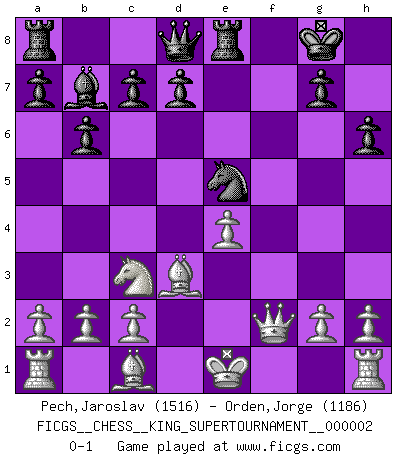 Last move : 0-1 2018 June 19 3:14:42 [Event "FICGS__CHESS__KING_SUPERTOURNAMENT__000002"] [Site "FICGS"] [Date "2018.05.01"] [Round "1"] [White "Pech,Jaroslav"] [Black "Orden,Jorge"] [Result "0-1"] [WhiteElo "1516"] [BlackElo "1186"] 1.e4 e5 2.f4 Nc6 3.Nf3 Nf6 4.fxe5 Nxe4 5.d3 Bc5 6.dxe4 O-O 7.Nc3 Re8 8.Ng5 Nxe5 9.Qh5 h6 10.Nxf7 Nxf7 11.Qxc5 b6 12.Qf2 Bb7 13.Bd3 Ne5 0-1 This chess game has been lost on time (started : 2018.05.01 22:10:15) King's gambit Kingside Castling by player Black (move 6) Player Black won this chess game. Follow this game move after move (download)War is the child of passion, passion is the child of narcissism and narcissism is the child. (...) Another game ? (Thibault de Vassal) Man kann eine Schachpartie nur gewinnen, wenn das Gleichgewicht gestört ist. In einer Stellung mit ungestörtem Gleichgewicht ist auch das größte Genie hilflos - in der Stellung steckt dann eben kein genialer Einfall. (Wilhelm Steinitz) Todavía soy una víctima del Ajedrez. Tiene toda la belleza del arte y mucho mas. No puede ser comercializado. El Ajedrez es mas puro que el arte en su posición social. (Marcel Duchamp) J'apprécie les joueurs d'est-indienne, c'est grâce à eux que je nourris ma famille depuis tant d'années. (Petrosian) The ego is not master in its own house. (Sigmund Freud)