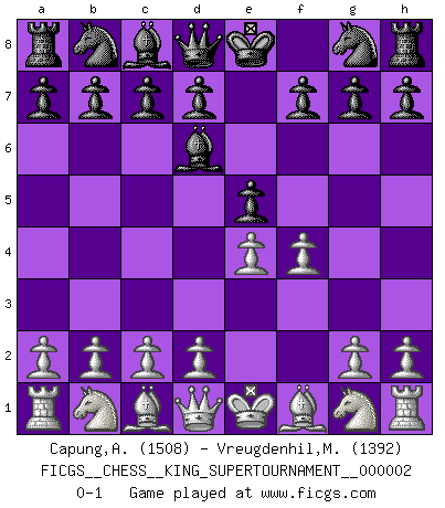 Last move : 0-1 2018 June 1 0:38:7 [Event "FICGS__CHESS__KING_SUPERTOURNAMENT__000002"] [Site "FICGS"] [Date "2018.05.01"] [Round "1"] [White "Capung,Albab"] [Black "Vreugdenhil,Maarten"] [Result "0-1"] [WhiteElo "1508"] [BlackElo "1392"] 1.e4 e5 2.f4 Bd6 0-1 This chess game has been lost on time (started : 2018.05.01 22:10:15) King's gambit Player Black won this chess game. Follow this game move after move (download)Chess is thirty to forty percent psychology. You don't have this when you play a computer. I can't confuse it. (Judith Polgar) Der Verteidiger gebe der Gewalt nach, aber nur der Gewalt. Er schaffe sich nicht freiwillig, etwa aus Blindheit oder aus Schrecken, irgendwelche Schwächen. Er lasse sich nicht bluffen. (Emanuel Lasker) Hasta este punto, las blancas han seguido un análisis bien conocido. Pero ahora el hace un error fatal: empieza a usar su propia cabeza. (Siegbert Tarrasch) Le pion, dans sa simplicité, marche droit devant lui, mais lorsqu'il prend, il le fait obliquement? Ainsi l'homme, tant qu'il reste pauvre, marche dans la droiture et vit honnêtement, mais lorsqu'il recherche les honneurs, il flatte, se parjure et, par les voies obliques, cherche une position supérieure sur l'échiquier du monde. (Jean de Galles) Art is not a thing, it is a way. (Elbert Hubbard)