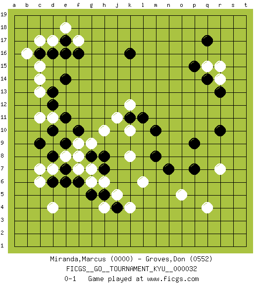 Last move : 0-1 2007 May 15 3:39:16 [Event "FICGS__GO__TOURNAMENT_KYU__000032"] [Site "FICGS"] [Date "2007.05.04"] [Round "1"] [Black "Miranda,Marcus"] [White "Groves,Don"] [Result "0-1"] [Rating 1 "0000"] [Rating 2 "0552"] 1.d16 d4 2.q17 q4 3.k16 r15 4.q14 r14 5.r13 q15 6.p15 c14 7.d10 f17 8.e14 c11 9.c9 c17 10.c16 d17 11.e16 b16 12.e17 e18 13.f16 c15 14.d13 c13 15.d12 d11 16.e11 c7 17.d8 k4 18.r10 r7 19.p9 k8 20.p7 o5 21.n7 l6 22.m8 k10 23.m10 k12 24.k11 j11 25.l11 h10 26.e6 d7 27.e7 e8 28.e9 f8 29.d6 c6 30.g8 f9 31.f10 g9 32.h8 f7 33.f6 g7 34.h7 g6 35.g5 h6 36.h5 j5 37.j4 h4 0-1 Here are the names of the openings (joseki) played in the four corners : Corner q16 : q17 r15 Komoku (Somok, Xiao~mu`) 3-4 Point. The komoku (3-4) point is the traditional corner enclosure move.. Ikken Kakari (Hankan Keolch'im, Yi Gua`jiao~, 1-Space Low Pincer). The small knight move is the basic approach move to the 3-4 point stone. It has been continually used for over four centuries. There are limitless variations, with new moves constantly being discovered. White 2 opens the door to a treaure store of joseki. Corner d16 : d16 c14 Hoshi (Hwajeom, Seongjeom, Xingwei`) 4-4 Point. The star or hoshi (4-4) point, emphasizing influence at the potential expense of territory. Ikken Kakari (Hankan Keolch'im, Yi Gua`jiao~, 1-Space Low Approach). White 2 is the standard approach move to the 4-4. Corner d4 : d4 c9 Hoshi (Hwajeom, Seongjeom, Xingwei`) 4-4 Point. The star or hoshi (4-4) point, emphasizing influence at the potential expense of territory. Player White won this Go (weiqi, baduk) game. Follow this game move after move (download)Beginner's games are surprising, often incoherent and incomprehensible. When you improve, your game gains in consistency but flirts with stupidity: you become satisfied with truisms and mechanical movements, you try to obtain a feeling for clearness and style the easy way. (Pierre Audouard) We need strong personalities and only one world champion to attract sponsors. (Anatoly Karpov)
