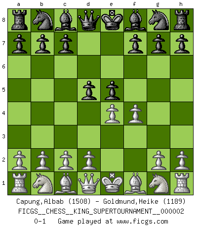 Last move : 0-1 2018 June 2 0:45:32 [Event "FICGS__CHESS__KING_SUPERTOURNAMENT__000002"] [Site "FICGS"] [Date "2018.05.01"] [Round "1"] [White "Capung,Albab"] [Black "Goldmund,Heike"] [Result "0-1"] [WhiteElo "1508"] [BlackElo "1189"] 1.e4 e5 2.f4 d5 0-1 This chess game has been lost on time (started : 2018.05.01 22:10:15) KGD : Falkbeer counter-gambit Player Black won this chess game. Follow this game move after move (download)If your opponent offers you a draw, try to work out why he thinks he's worse off. (Nigel Short) Ein typischer, sehr verbreiteter Gedankenschädling ist der, daß der betreffende Amateur von der Annanhme ausgeht, daß jeder einzelne Zug etwas zu leisten habe. (Aaron Nimzowitsch) Me siento como si fuera una pieza en una partida de Ajedrez, cuando mi oponente me indica: esa pieza no puede ser movida. (Soren Kierkegaard) La menace est plus forte que l'exécution. (Aaron Nimzovitch) If only faces could talk... (Pat Summerall, Sportscaster during the Super Bowl)