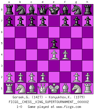 Last move : 1-0 2018 June 1 0:38:7 [Event "FICGS__CHESS__KING_SUPERTOURNAMENT__000002"] [Site "FICGS"] [Date "2018.05.01"] [Round "1"] [White "Gorsek,Gregor"] [Black "Konyukhov,Konstantin"] [Result "1-0"] [WhiteElo "1427"] [BlackElo "1379"] 1.e4 e5 2.f4 1-0 This chess game has been lost on time (started : 2018.05.01 22:10:15) King's gambit Player White won this chess game. Follow this game move after move (download)The enormous mental resilience, without which no Chess player can exist, was so much taken up by Chess that he could never free his mind of this game. (Albert Einstein) Kostenjuk hat keinen Sexappeal. (Loek van Wely) Fischer era un maestro de claridad y un Rey del posicionamiento astuto. Sus oponentes podían ver hacia donde se dirigía pero eran impotentes para detenerlo. (Bruce Pandolfini) Le thème de l'attaque double intervient d'une manière ou d'une autre dans l'immense majorité des combinaisons. (Youri Averbakh) Macintosh - we might not get everything right, but at least we knew the century was going to end. (Douglas Adams)