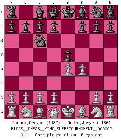 Last move : 0-1 2018 June 2 0:45:32 [Event "FICGS__CHESS__KING_SUPERTOURNAMENT__000002"] [Site "FICGS"] [Date "2018.05.01"] [Round "1"] [White "Gorsek,Gregor"] [Black "Orden,Jorge"] [Result "0-1"] [WhiteElo "1427"] [BlackElo "1186"] 1.e4 e5 2.f4 Nc6 0-1 This chess game has been lost on time (started : 2018.05.01 22:10:15) King's gambit Player Black won this chess game. Follow this game move after move (download)Via the squares on the chessboard, the Indians explain the movement of time and the age, the higher influences which control the world and the ties which link Chess with the human soul. (Al-Masudi) Alle Schachspieler sollten auch ein Hobby haben. (Savielly Grigorievitsch Tartakower) El hombre es un frívolo, una creatura engañosa y como un jugador de Ajedrez, se preocupa mas por el proceso de obtener su meta que de la meta por sí misma. (Dostoyevsky) Le génie consiste à savoir transgresser les règles au moment opportun. (Teichmann) The next best thing to gambling and winning is gambling and loosing. (Nick Dandalos)