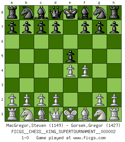 Last move : 1-0 2018 June 1 0:38:7 [Event "FICGS__CHESS__KING_SUPERTOURNAMENT__000002"] [Site "FICGS"] [Date "2018.05.01"] [Round "1"] [White "MacGregor,Steven"] [Black "Gorsek,Gregor"] [Result "1-0"] [WhiteElo "1149"] [BlackElo "1427"] 1.e4 e5 2.f4 1-0 This chess game has been lost on time (started : 2018.05.01 22:10:15) King's gambit Player White won this chess game. Follow this game move after move (download)Nowadays, when you're not a grandmaster at 14, you can forget about it. (Anand Viswanathan) Man kann eine Schachpartie nur gewinnen, wenn das Gleichgewicht gestört ist. In einer Stellung mit ungestörtem Gleichgewicht ist auch das größte Genie hilflos - in der Stellung steckt dann eben kein genialer Einfall. (Wilhelm Steinitz) Yo tuve un dolor de muelas en la primer partida. En el segundo juego, tuve un dolor de cabeza. En el tercero, tuve un ataque de reumatísmo. En la cuarta partida, no me sentía muy bien. ¿Y en el quinto juego? Bueno, ¿que acaso uno tiene que ganar todos los juegos?. (Siegbert Tarrasch) Toutes choses étant égales, c'est la conviction qui gagne. Alliée à une volonté de vaincre, elle sert de détonateur, suscite des idées, disperse les doutes et aide à penser clairement. (Robert Fischer) Beep ! (R2D2 in Star Wars ep.3)