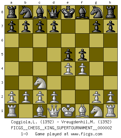 Last move : 1-0 2018 June 2 0:45:32 [Event "FICGS__CHESS__KING_SUPERTOURNAMENT__000002"] [Site "FICGS"] [Date "2018.05.01"] [Round "1"] [White "Coggiola,Leandro Damian"] [Black "Vreugdenhil,Maarten"] [Result "1-0"] [WhiteElo "1392"] [BlackElo "1392"] 1.e4 e5 2.f4 f5 3.Nc3 1-0 This chess game has been lost on time (started : 2018.05.01 22:10:15) King's gambit Player White won this chess game. Follow this game move after move (download)When asked, -How is that you pick better moves than your opponents?, I responded: I'm very glad you asked me that, because, as it happens, there is a very simple answer. I think up my own moves, and I make my opponent think up his. (Alexander Alekhine) Der Umstand, daß uns eine 7 Stunden Zeitkontrolle ermöglicht eine großartige, tiefe Partie zu spielen, ist für die Massenmedien nicht weiter von Bedeutung. (Alexej Shirov) El Ajedrez es el arte del análisis. (Mikhail Botvinnik) A ce moment-là, je menaçais de comprendre la position ! (Clément L'Heureux) Just because you do not take an interest in politics doesn't mean politics won't take an interest in you. (Pericles 430 B.C.)