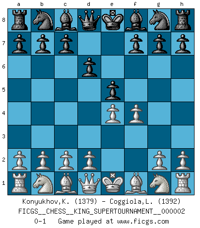 Last move : 0-1 2018 June 1 12:40:23 [Event "FICGS__CHESS__KING_SUPERTOURNAMENT__000002"] [Site "FICGS"] [Date "2018.05.01"] [Round "1"] [White "Konyukhov,Konstantin"] [Black "Coggiola,Leandro Damian"] [Result "0-1"] [WhiteElo "1379"] [BlackElo "1392"] 1.e4 e5 2.f4 d6 0-1 This chess game has been lost on time (started : 2018.05.01 22:10:15) King's gambit Player Black won this chess game. Follow this game move after move (download)Of all my Russian books, the defense contains and diffuses the greatest 'warmth' which may seem odd seeing how supremely abstract Chess is supposed to be. (Vladimir Nabokov) Nur ein wirklich starker Spieler weiß wie schwach er spielt. (Savielly Grigorievitsch Tartakower) Cuando estes solo, cuando te sientas un extraño en el mundo, juega al Ajedrez. Esto levantará tu espiritu y será tu consejero de guerra. (Aristóteles) Les Echecs mettent en conflit, non pas deux intelligences, mais deux volontés. (Lasker) There are lots of people who mistake their imagination for their memory. (Josh Bilings)