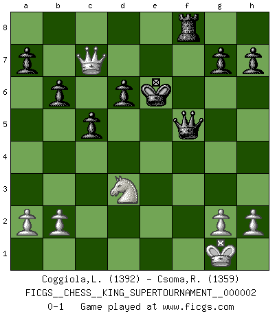 Last move : 0-1 2018 May 22 1:43:10 [Event "FICGS__CHESS__KING_SUPERTOURNAMENT__000002"] [Site "FICGS"] [Date "2018.05.01"] [Round "1"] [White "Coggiola,Leandro Damian"] [Black "Csoma,Robert"] [Result "0-1"] [WhiteElo "1392"] [BlackElo "1359"] 1.e4 e5 2.f4 Nf6 3.Nc3 d6 4.Nf3 Be7 5.Bc4 O-O 6.O-O Nc6 7.d4 exd4 8.Nxd4 Bg4 9.Qd3 Nb4 10.Qg3 c5 11.Nb3 Be6 12.Bxe6 fxe6 13.f5 exf5 14.exf5 Nxc2 15.Bh6 Rf7 16.Rac1 Nb4 17.Bf4 Nh5 18.Qf3 Nxf4 19.Qxf4 Nd3 20.Qc4 Nxc1 21.Nxc1 Kf8 22.Nd3 Qd7 23.Nd5 Rxf5 24.Rxf5+ Qxf5 25.Nxe7 Kxe7 26.Qb5 b6 27.Qc6 Rf8 28.Qc7+ Ke6 0-1 KGD : 2...Nf6 Kingside Castling by player Black (move 5) Kingside Castling by player White (move 6) Player Black won this chess game. Follow this game move after move (download)The most powerful weapon in Chess is to have the next move. (David Bronstein) Privat ist Kortschnoi kein schlechter Mensch, sehr sympathisch. Aber während des Spiels ist er grausam. Er will dich töten. (Miguel Najdorf) El tablero es el mundo, las piezas es el fenomeno del universo, las reglas del juego son lo que llamamos leyes de la naturaleza y el jugador del lado opuesto, se encuentra oculto a nuestra vista. (Thomas Huxley) Même si vous avez un bon coup à faire, regardez toujours s'il n'y en a pas un qui lui soit préférable. (Pedro Damiano) Tree pose grows confidence. It roots me to this world. (Terri Guillemets)
