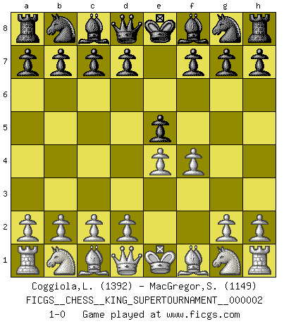 Last move : 1-0 2018 June 1 0:38:7 [Event "FICGS__CHESS__KING_SUPERTOURNAMENT__000002"] [Site "FICGS"] [Date "2018.05.01"] [Round "1"] [White "Coggiola,Leandro Damian"] [Black "MacGregor,Steven"] [Result "1-0"] [WhiteElo "1392"] [BlackElo "1149"] 1.e4 e5 2.f4 1-0 This chess game has been lost on time (started : 2018.05.01 22:10:15) King's gambit Player White won this chess game. Follow this game move after move (download)There is only one thing Fischer does in Chess without pleasure: to lose ! (Boris Spassky) Der Partner hat auch seine Existenzberechtigung. (Savielly Grigorievitsch Tartakower) Las Aperturas te enseñan aperturas. ¡Los Finales te enseñan Ajedrez!. (Stephan Gerzadowicz) Ne tendez aucun piège pour le plaisir ! Ne jouez rien dans l'espoir que l'adversaire réagisse de façon stupide ! Prenez toujours pour acquis que l'adversaire va trouver le meilleur coup ! Ne jouez jamais de coup dans l'espoir que l'adversaire ne voie pas la menace ! Chacun de vos coups doit améliorer la position d'une façon ou d'une autre. Some people are so afraid to die that they never begin to live. (Henry Van Dyke)