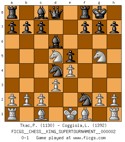Last move : 0-1 2018 June 13 2:44:42 [Event "FICGS__CHESS__KING_SUPERTOURNAMENT__000002"] [Site "FICGS"] [Date "2018.05.01"] [Round "1"] [White "Tkac,Patrik"] [Black "Coggiola,Leandro Damian"] [Result "0-1"] [WhiteElo "1130"] [BlackElo "1392"] 1.e4 e5 2.f4 d6 3.fxe5 dxe5 4.Nf3 Bd6 5.Nc3 Nf6 6.Ng5 O-O 7.d3 Nc6 8.Qf3 Nd4 9.Qf2 Ng4 10.Nd5 Nxf2 0-1 This chess game has been lost on time (started : 2018.05.01 22:10:15) King's gambit Kingside Castling by player Black (move 6) Player Black won this chess game. Follow this game move after move (download)You know, comrade Pachman, I don't enjoy being a Minister, I would rather play Chess like you. (Che Guevara) Wie, soll nun auch die Opposition abgeschafft werden? Ja, es tut mir leid, Ihnen diesen Schmerz nicht ersparen zu können. (Aaron Nimzowitsch) El Ajedrez es un cuento de Hadas de las 1001 metidas de pata. (Savielly Tartakower) Des idées, des idées, j'en ai cent, j'en ai mille. Des bonnes, des mauvaises, applicables, irréalisables... Il suffit de faire le tri ! (Roos) Plans are ideas that never come to fruition. (Daniel Parmet)