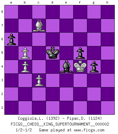 Last move : 1/2-1/2 2018 July 6 17:27:6 [Event "FICGS__CHESS__KING_SUPERTOURNAMENT__000002"] [Site "FICGS"] [Date "2018.05.01"] [Round "1"] [White "Coggiola,Leandro Damian"] [Black "Pipac,Darko"] [Result "1/2-1/2"] [WhiteElo "1392"] [BlackElo "1124"] 1.e4 e5 2.f4 d5 3.exd5 exf4 4.Nf3 Qxd5 5.Nc3 Qe6+ 6.Be2 Nf6 7.O-O Bc5+ 8.d4 Bd6 9.Nb5 O-O 10.Nxd6 Qxd6 11.c3 h6 12.Ne5 g5 13.b4 Nc6 14.Nc4 Qd5 15.Bb2 Ne4 16.Bf3 Qxc4 17.Bxe4 b6 18.Qh5 Kg7 19.d5 Qxe4 20.dxc6 Qxc6 21.Rad1 Bb7 22.Qg4 Kh7 23.Qf5+ Kg8 24.Rd2 Rad8 25.R1f2 Rxd2 26.Rxd2 Re8 27.h4 f3 28.gxf3 Qxf3 29.Qxf3 Bxf3 30.Kf2 Bg4 31.hxg5 hxg5 32.Kg3 Be6 33.a3 f6 34.Re2 Kf7 35.Bc1 Bd7 36.Rd2 Be6 37.Re2 g4 38.Re4 f5 39.Re5 Bd7 40.Rd5 Ke6 41.Rd1 Bc6 42.Bf4 Bf3 43.Re1+ Kd7 44.Rxe8 Kxe8 45.Bxc7 Kd7 46.Bb8 a6 47.Kf4 Be4 48.a4 Kc6 49.Be5 Kd5 50.Bc7 b5 51.axb5 1/2-1/2 KGD : Falkbeer counter-gambit Kingside Castling by player White (move 7) Kingside Castling by player Black (move 9) 10 pieces endgame at move 51 : White KBPPP , Black KBPPP WHITE : King + 1 Bishop 3 Pawns BLACK : King + 1 Bishop 3 Pawns This chess game ended in a draw. Follow this game move after move (download)Chess is a cold bath for the mind. (Sir John Simon) Der vorletzte Fehler gewinnt. (Savielly Grigorievitsch Tartakower) El estómago es una parte esencial del maestro de Ajedrez. (Bent Larsen) D'abord les bases : Jouez et étudiez, puis étudiez et jouez, ensuite jouez et étudiez, puis étudiez et jouez. Deuxièmement : Donnez toujours le meilleur de vous-même ! (Ken Smith) If you have any trouble condescending, find a Unix user to show you how it's done. (Scott Adams)
