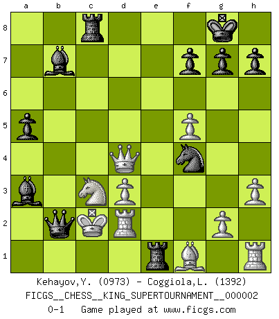 Last move : 0-1 2018 June 13 20:16:51 [Event "FICGS__CHESS__KING_SUPERTOURNAMENT__000002"] [Site "FICGS"] [Date "2018.05.01"] [Round "1"] [White "Kehayov,Yulian"] [Black "Coggiola,Leandro Damian"] [Result "0-1"] [WhiteElo "0973"] [BlackElo "1392"] 1.e4 e5 2.f4 d6 3.f5 Nf6 4.d3 Be7 5.Nc3 O-O 6.Bd2 b6 7.Qe2 Bb7 8.O-O-O c5 9.Nf3 Nc6 10.a3 Nd4 11.Nxd4 cxd4 12.Na2 a5 13.Kb1 d5 14.exd5 Nxd5 15.c4 Nf6 16.h3 Qd7 17.Qxe5 Rfe8 18.Qg3 b5 19.cxb5 Qxb5 20.Bf4 Bxa3 21.Qf2 Nd5 22.Qxd4 Nxf4 23.Rd2 Re1+ 24.Kc2 Rc8+ 25.Nc3 Qxb2+ 0-1 King's gambit Kingside Castling by player Black (move 5) Queenside Castling by player White (move 8) Player Black won this chess game. Follow this game move after move (download)An attack on the wing should be met by play in the center. (Nimzovitch) Je mehr wir mit Computern analysieren, desto mehr glauben wir an Verteidigung. (Vladimir Kramnik) Las leyes del Ajedrez no permiten una libre elección: tienes que mover quieras o no. (Emanuel Lasker) Les Echecs sont et restent toujours un combat, un combat intégral comme la boxe, la lutte ou un autre sport, et où il doit y avoir un vainqueur et un vaincu. (Joseph Emil Diemer) Success without honor is an unseasoned dish; it will satisfy your hunger, but it won't taste good. (Joe Paterno)