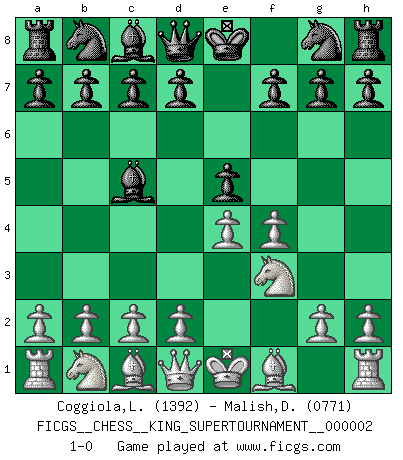 Last move : 1-0 2018 June 2 12:44:50 [Event "FICGS__CHESS__KING_SUPERTOURNAMENT__000002"] [Site "FICGS"] [Date "2018.05.01"] [Round "1"] [White "Coggiola,Leandro Damian"] [Black "Malish,Dmitriy"] [Result "1-0"] [WhiteElo "1392"] [BlackElo "0771"] 1.e4 e5 2.f4 Bc5 3.Nf3 1-0 This chess game has been lost on time (started : 2018.05.01 22:10:15) KGD : Classical variation Player White won this chess game. Follow this game move after move (download)Chess demands total concentration. (Bobby Fischer) Schach ist eine Sache der genauen Beurteilung, wann man zuschlagen und wann man sich ducken muss. (Robert James Fischer) Ciertamente el estado mental actual de Bobby Fischer es una tragedia. Uno de los mas grandes jugadores de Ajedrez del mundo -el orgullo y pena del Ajedrez Americano. (Frank Brady) La tactique, c'est ce que vous faites quand il y a quelque chose à faire; la stratégie, c'est ce que vous faites quand il n'y a rien à faire. (Savielli Tartacower) I don't believe in psychology. I believe in good moves. (Bobby Fischer)