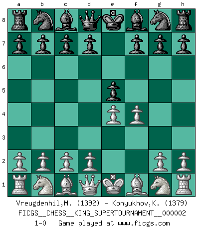 Last move : 1-0 2018 June 1 0:38:7 [Event "FICGS__CHESS__KING_SUPERTOURNAMENT__000002"] [Site "FICGS"] [Date "2018.05.01"] [Round "1"] [White "Vreugdenhil,Maarten"] [Black "Konyukhov,Konstantin"] [Result "1-0"] [WhiteElo "1392"] [BlackElo "1379"] 1.e4 e5 2.f4 1-0 This chess game has been lost on time (started : 2018.05.01 22:10:15) King's gambit Player White won this chess game. Follow this game move after move (download)Botvinnik tried to take the mystery out of Chess, always relating it to situations in ordinary life. He used to call Chess a typical inexact problem similar to those which people are always having to solve in everyday life. (Garry Kasparov) Deine Wertungszahl - vorausgesetzt einige Jahre schachliche Anstrengung - entspricht etwa dem zehnfachen Deines IQ plus 1000. (Jonathan Levitt) En el Ajedrez, tal como es jugado por los Maestros, practicamente la suerte es eliminada. (Emanuel Lasker) Pour moi, les échecs ne sont pas un jeu mais un art. (Alexandre Alekhine) Wisdom is the reward you get for a lifetime of listening when you'd have preferred to talk. (Doug Larson)