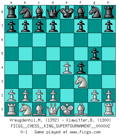 Last move : 0-1 2018 June 3 12:52:57 [Event "FICGS__CHESS__KING_SUPERTOURNAMENT__000002"] [Site "FICGS"] [Date "2018.05.01"] [Round "1"] [White "Vreugdenhil,Maarten"] [Black "Klawitter,Bernd"] [Result "0-1"] [WhiteElo "1392"] [BlackElo "1300"] 1.e4 e5 2.f4 exf4 3.Nf3 g5 0-1 This chess game has been lost on time (started : 2018.05.01 22:10:15) King's knight's gambit Player Black won this chess game. Follow this game move after move (download)Bobby Fischer is the greatest Chess player who has ever lived. (Ken Smith) Ihnen, Herr Lasker, habe ich nur drei Worte zu sagen: Schach und matt. (Siegbert Tarrasch) Tu eres para mi la Reina en d8 y yo soy el Peón en d7!!. (GM Eduard Gufeld) Toutes choses étant égales, c'est la conviction qui gagne. Alliée à une volonté de vaincre, elle sert de détonateur, suscite des idées, disperse les doutes et aide à penser clairement. (Robert Fischer) Looking at the proliferation of personal web pages on the Net, it looks like very soon everyone on Earth will have 15 megabytes of fame. (M.G. Sriram)