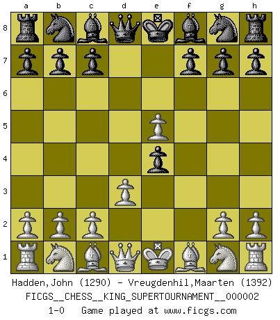 Last move : 1-0 2018 June 4 13:2:53 [Event "FICGS__CHESS__KING_SUPERTOURNAMENT__000002"] [Site "FICGS"] [Date "2018.05.01"] [Round "1"] [White "Hadden,John"] [Black "Vreugdenhil,Maarten"] [Result "1-0"] [WhiteElo "1290"] [BlackElo "1392"] 1.e4 e5 2.f4 d5 3.d3 dxe4 4.fxe5 1-0 This chess game has been lost on time (started : 2018.05.01 22:10:15) KGD : Falkbeer counter-gambit Player White won this chess game. Follow this game move after move (download)Why must I lose to this idiot ? (Aron Nimzovich) Der Freibauer hat für mich eine Seele, genau wie der Mensch, Wünsche, die unerkannt in ihm schlummern, und Befürchtungen, von deren Existenz er selbst kaum ahnt. (Aaron Nimzowitsch) Todos los jugadores de Ajedrez deberían tener un pasatiempo. (Savielly Tartakower) Mais l'homme est une créature légère et illogique : semblable au joueur d'échecs, il n'aime que le processus du but à atteindre, non le but lui-même. (Dostoïevsky) Before all elsed, be armed. (Niccolo Machiavelli)