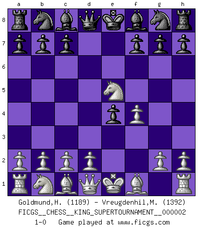Last move : 1-0 2018 June 4 13:2:53 [Event "FICGS__CHESS__KING_SUPERTOURNAMENT__000002"] [Site "FICGS"] [Date "2018.05.01"] [Round "1"] [White "Goldmund,Heike"] [Black "Vreugdenhil,Maarten"] [Result "1-0"] [WhiteElo "1189"] [BlackElo "1392"] 1.e4 e5 2.f4 d5 3.Nf3 dxe4 4.Nxe5 1-0 This chess game has been lost on time (started : 2018.05.01 22:10:15) KGD : Falkbeer, Tartakower variation Player White won this chess game. Follow this game move after move (download)Chess is a matter of delicate judgment, knowing when to punch and how to duck. (Bobby Fischer) Nie in meinem Leben habe ich die französische Verteidigung gespielt, welche die Stumpfsinnigste von allen ist. (Wilhelm Steinitz) Observen a Garry Kasparov. Después de una derrota, invariablemente el gana la próxima partida. Prácticamente hace pedazos a su siguiente oponente. Eso es algo que tenemos que aprender a lograr. (Maurice Ashley) La vérité est comme le meilleur coup aux échecs : elle existe, mais il faut la chercher. (Arturo Perez-Reverte) Better than a thousand days of diligent study is one day with a great teacher. (Japanese proverb)