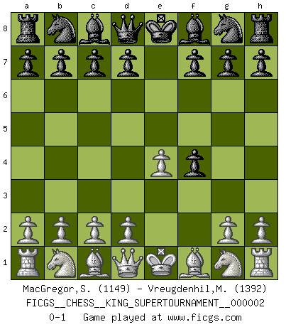 Last move : 0-1 2018 June 1 0:38:7 [Event "FICGS__CHESS__KING_SUPERTOURNAMENT__000002"] [Site "FICGS"] [Date "2018.05.01"] [Round "1"] [White "MacGregor,Steven"] [Black "Vreugdenhil,Maarten"] [Result "0-1"] [WhiteElo "1149"] [BlackElo "1392"] 1.e4 e5 2.f4 exf4 0-1 This chess game has been lost on time (started : 2018.05.01 22:10:15) King's gambit accepted Player Black won this chess game. Follow this game move after move (download)If I win a tournament, I win it by myself. I do the playing. Nobody helps me. (Bobby Fischer) Wenn ich einen Club besuche, sind die Spieler stumm vor Staunen. (José Raúl Capablanca) Combinaciones deslumbrantes son para la mayoría, mover madera es para los pocos. (Georg Kieninger) A ce moment-là, je menaçais de comprendre la position ! (Clément L'Heureux) I fear not the man who has practiced 10,000 kicks once, but I fear the man who has practiced one kick 10,000 times. (Bruce Lee)