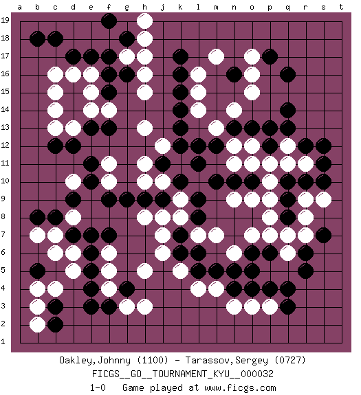 Last move : 1-0 2007 June 19 13:11:6 [Event "FICGS__GO__TOURNAMENT_KYU__000032 "] [Site "FICGS"] [Date "2007.05.04"] [Round "1"] [Black "Oakley,Johnny "] [White "Tarassov,Sergey "] [Result "1-0"] [Rating 1 "1100"] [Rating 2 "0727"] 1.q16 c4 2.q4 c16 3.e17 d13 4.c18 o17 5.k17 h17 6.k15 h15 7.p17 o15 8.n16 o16 9.q14 l16 10.k16 m17 11.k13 m13 12.g16 h16 13.d15 c15 14.e13 e14 15.d14 c14 16.d12 c13 17.f13 e16 18.d17 d16 19.f16 f14 20.g18 g17 21.f17 h18 22.f19 h19 23.b18 o3 24.r6 l4 25.e3 g3 26.g4 f4 27.f3 h3 28.e4 f5 29.c3 d5 30.e5 f6 31.e6 d6 32.f7 h5 33.d7 c7 34.c8 d8 35.e7 b7 36.d9 b3 37.c2 b2 38.b5 b4 39.b8 c6 40.q3 q12 41.r10 r8 42.q9 q7 43.o5 o7 44.m5 m7 45.p12 p11 46.r12 o12 47.p13 r11 48.s11 q11 49.s12 h13 50.c12 k11 51.l11 p9 52.l12 k9 53.n13 n14 54.j11 j12 55.k10 j10 56.k12 h11 57.l9 k8 58.l8 l7 59.j9 k11 60.f15 e15 61.j11 h10 62.k7 j8 63.h9 j7 64.k6 h8 65.g9 j6 66.l5 k5 67.l6 m4 68.n4 n3 69.o13 n12 70.m12 n11 71.o10 p10 72.s10 n9 73.m10 l14 74.k14 l15 75.n10 o11 76.o4 p3 77.p4 n6 78.n5 f11 79.e11 f10 80.f9 d10 81.e10 r9 82.q10 o9 83.q13 q6 84.r5 s9 85.q8 p8 86.o6 r7 87.p6 p7 88.s7 1-0 Here are the names of the openings (joseki) played in the four corners : Corner d16 : c16 e17Komoku (Somok, Xiao~mu`) 3-4 Point. The komoku (3-4) point is the traditional corner enclosure move..Ikken Kakari (Hankan Keolch'im, Yi Gua`jiao~, 1-Space Low Pincer). The small knight move is the basic approach move to the 3-4 point stone. It has been continually used for over four centuries. There are limitless variations, with new moves constantly being discovered. Black 2 opens the door to a treaure store of joseki. Corner q16 : q16 o17Hoshi (Hwajeom, Seongjeom, Xingwei`) 4-4 Point. The star or hoshi (4-4) point, emphasizing influence at the potential expense of territory.Ikken Kakari (Hankan Keolch'im, Yi Gua`jiao~, 1-Space Low Approach). White 2 is the standard approach move to the 4-4. Corner q4 : q4 o3Hoshi (Hwajeom, Seongjeom, Xingwei`) 4-4 Point. The star or hoshi (4-4) point, emphasizing influence at the potential expense of territory.Ikken Kakari (Hankan Keolch'im, Yi Gua`jiao~, 1-Space Low Approach). White 2 is the standard approach move to the 4-4. Corner d4 : c4 e3Komoku (Somok, Xiao~mu`) 3-4 Point. The komoku (3-4) point is the traditional corner enclosure move..Ikken Kakari (Hankan Keolch'im, Yi Gua`jiao~, 1-Space Low Pincer). The small knight move is the basic approach move to the 3-4 point stone. It has been continually used for over four centuries. There are limitless variations, with new moves constantly being discovered. Black 2 opens the door to a treaure store of joseki. Player Black won this Go (weiqi, baduk) game.Follow this game move after move (download ) Use a wall to attack, not to make territory. (Anonymous) The difference between stupidity and genius is that genius has its limits. (Murphy)
