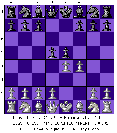 Last move : 0-1 2018 June 2 0:45:32 [Event "FICGS__CHESS__KING_SUPERTOURNAMENT__000002"] [Site "FICGS"] [Date "2018.05.01"] [Round "1"] [White "Konyukhov,Konstantin"] [Black "Goldmund,Heike"] [Result "0-1"] [WhiteElo "1379"] [BlackElo "1189"] 1.e4 e5 2.f4 d5 0-1 This chess game has been lost on time (started : 2018.05.01 22:10:15) KGD : Falkbeer counter-gambit Player Black won this chess game. Follow this game move after move (download)Chess is really ninety nine percent calculation. (Soltis) Im Schach gibt es keinen Platz für Galanterie. (Irving Chernev) Un buen jugador siempre tiene buena suerte. (José Raúl Capablanca) Le système Elo représente seulement une moyenne. Il est simplement un indicateur de votre stabilité. (Anatoli Karpov) Creativity is allowing yourself to make mistakes. Art is knowing which ones to keep. (Scott Adams)