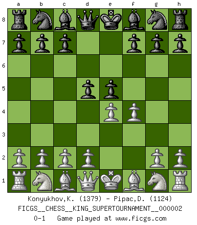Last move : 0-1 2018 June 1 12:40:23 [Event "FICGS__CHESS__KING_SUPERTOURNAMENT__000002"] [Site "FICGS"] [Date "2018.05.01"] [Round "1"] [White "Konyukhov,Konstantin"] [Black "Pipac,Darko"] [Result "0-1"] [WhiteElo "1379"] [BlackElo "1124"] 1.e4 e5 2.f4 d5 0-1 This chess game has been lost on time (started : 2018.05.01 22:10:15) KGD : Falkbeer counter-gambit Player Black won this chess game. Follow this game move after move (download)On the chessboard, lies and hypocrisy do not survive long. (Emanuel Lasker) Das Schachspiel ist ein See, in welchem eine Mücke baden und ein Elefant ertrinken kann. (Emanuel Lasker) El jugador blanco perdió porque fallo en recordar la coreccta continuación y tuvo que pensar por sí mismo las movidas. (Siegbert Tarrasch) Toute estimation doit être constamment réévaluée. (Jacob Estrin) There is far too much law for those who can afford it and far too little for those who cannot. (Derek Bok)