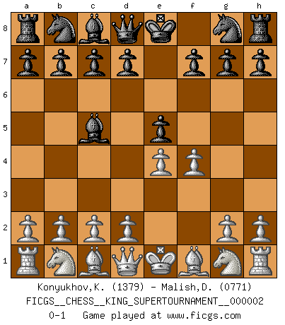Last move : 0-1 2018 June 2 12:44:50 [Event "FICGS__CHESS__KING_SUPERTOURNAMENT__000002"] [Site "FICGS"] [Date "2018.05.01"] [Round "1"] [White "Konyukhov,Konstantin"] [Black "Malish,Dmitriy"] [Result "0-1"] [WhiteElo "1379"] [BlackElo "0771"] 1.e4 e5 2.f4 Bc5 0-1 This chess game has been lost on time (started : 2018.05.01 22:10:15) KGD : Classical variation Player Black won this chess game. Follow this game move after move (download)Of Chess it has been said that life is not long enough for it, but that is the fault of life, not Chess. (William Ewart Napier) Konzentriere dich auf materielle Gewinne. Nimm, was dir dein Gegner gibt, ausser es gibt einen guten Grund der dagegenspricht. (Robert James Fischer) Estaba muy claro de que el punto vulnerable del Gran Maestro Americano (Bobby Fischer) radicaba en las posiciones de doble filo, colgantes, irracionales, donde el siempre falló en encontrar un triunfo aún en una posición de clara victoria. (Efim Geller) Vous savez, camarade Pachman, je n'éprouve pas de plaisir à être ministre, je jouerais plutôt aux échecs comme vous, ou alors ferais une révolution au Venezuela. (Che Guevara à Ludek Pachman, 'Checkmate in Prague', 1975) I think your argument is specious - I think your tie is ugly. (Gregory House to Dr. Foreman, House M.D.)