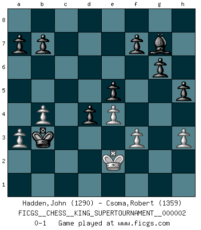 Last move : 0-1 2018 June 19 23:20:26 [Event "FICGS__CHESS__KING_SUPERTOURNAMENT__000002"] [Site "FICGS"] [Date "2018.05.01"] [Round "1"] [White "Hadden,John"] [Black "Csoma,Robert"] [Result "0-1"] [WhiteElo "1290"] [BlackElo "1359"] 1.e4 e5 2.f4 Nf6 3.d3 d6 4.fxe5 dxe5 5.Bg5 Be7 6.Be2 O-O 7.Nf3 Nc6 8.Nc3 Be6 9.Bxf6 Bxf6 10.O-O Nd4 11.a3 g6 12.Qc1 Bg7 13.Ng5 Nxe2+ 14.Nxe2 Bg4 15.Nc3 h6 16.Nf3 c6 17.b4 Bxf3 18.Rxf3 Qd4+ 19.Kh1 Qxc3 20.Qd1 c5 21.d4 Qxd4 22.Qxd4 cxd4 23.Rd1 Rac8 24.Rd2 Rc7 25.h3 Rfc8 26.Kh2 Rxc2 27.Rxc2 Rxc2 28.Kg3 Rc3 29.Kf2 Rxf3+ 30.gxf3 Kf8 31.Ke2 Ke7 32.Kd3 Kd6 33.Kc2 Kc6 34.Kd3 Kb5 35.Kc2 Kc4 36.Kd2 h5 37.Ke2 Kb3 0-1 KGD : 2...Nf6 Kingside Castling by player Black (move 6) Kingside Castling by player White (move 10) Player Black won this chess game. Follow this game move after move (download)Robert Fischer is a law unto himself. (Larry Evans) Immer nach dem besten Zug zu suchen ist ziemlich unpraktisch. (Nigel Short) Un buen sacrificio es aquel que aunque no sea necesariamente sólido, deja a tu oponente aturdido y confuso. (Rudolph Spielmann) Un millionnaire : 'Monsieur Steinitz ! Vous ne participez aux tournois que pour l'argent, alors que moi je n'y viens que pour l'honneur.' Steinitz : 'Chacun joue pour ce qu'il n'a pas'... Remember : Your focus determines your reality. (Qui-Gon Jinn in Star Wars ep.1)