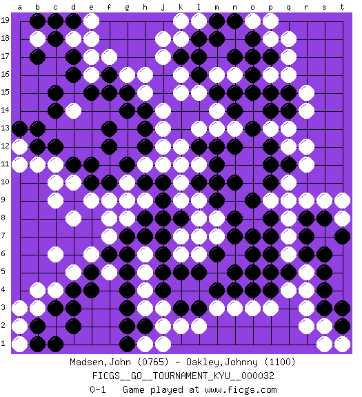 Last move : 0-1 2007 September 10 14:41:45 [Event "FICGS__GO__TOURNAMENT_KYU__000032"] [Site "FICGS"] [Date "2007.05.04"] [Round "1"] [Black "Madsen,John"] [White "Oakley,Johnny"] [Result "0-1"] [Rating 1 "0765"] [Rating 2 "1100"] 1.d17 q4 2.d4 q16 3.c15 k16 4.o17 q17 5.o15 n16 6.o16 q13 7.n17 m16 8.r6 r9 9.s4 r3 10.s3 n3 11.p6 p9 12.o13 l13 13.l18 j17 14.p12 q12 15.m12 k11 16.p11 q10 17.m10 n6 18.o5 p3 19.n5 l6 20.m4 m3 21.n7 n9 22.m6 l9 23.m9 m8 24.n8 l8 25.o9 c6 26.g3 b4 27.c3 c9 28.k3 s2 29.t2 r2 30.c12 b3 31.b2 c2 32.d2 c4 33.d3 l2 34.g6 f7 35.g7 f17 36.f16 g16 37.f15 e17 38.d16 d18 39.c18 e19 40.g15 h16 41.f12 d5 42.e5 e6 43.f6 f8 44.e10 d14 45.c14 c11 46.d11 b11 47.d9 d8 48.b12 c10 49.j5 c19 50.b19 b18 51.d19 e18 52.b17 k18 53.l17 j2 54.h2 g13 55.f13 g12 56.h14 h15 57.g14 e16 58.e15 a12 59.a13 a11 60.b13 g8 61.j7 j3 62.j4 h3 63.g2 h4 64.g4 h9 65.g11 j12 66.h12 j13 67.h13 j14 68.s8 s9 69.r8 o8 70.n10 p18 71.o18 t8 72.t7 t9 73.s6 a2 74.c1 q7 75.p8 q8 76.o7 q6 77.r7 r5 78.s5 e9 79.q11 r11 80.l16 l15 81.m15 m14 82.n15 d10 83.f10 f5 84.e4 h5 85.g5 k10 86.l3 k2 87.q15 r15 88.q14 r14 89.p17 q18 90.p10 q9 91.l5 k6 92.j6 k15 93.j8 n13 94.n12 p5 95.o4 o3 96.k17 j18 97.h10 p13 98.p14 l19 99.m18 h1 100.g1 j1 101.k5 m7 102.o6 s1 103.m19 k19 104.n14 m13 105.l12 k12 106.l10 k9 107.c19 t1 108.t3 o19 109.n19 p19 110.p4 l11 111.q5 r4 112.m11 p16 113.p15 r12 114.h8 g9 115.j10 g10 116.j9 j11 117.p7 h6 118.p5 a3 119.pass a1 120.b1 h11 121.n4 k7 122.k8 l7 123.h7 f9 124.e11 pass 125.pass pass 0-1 Comment by player 1 : John Madsen : Tx for the game! Here are the names of the openings (joseki) played in the four corners : Corner q16 : q16 o17 Hoshi (Hwajeom, Seongjeom, Xingwei`) 4-4 Point. The star or hoshi (4-4) point, emphasizing influence at the potential expense of territory. Ikken Kakari (Hankan Keolch'im, Yi Gua`jiao~, 1-Space Low Approach). Black 2 is the standard approach move to the 4-4. Corner q4 : q4 r6 Hoshi (Hwajeom, Seongjeom, Xingwei`) 4-4 Point. The star or hoshi (4-4) point, emphasizing influence at the potential expense of territory. Ikken Kakari (Hankan Keolch'im, Yi Gua`jiao~, 1-Space Low Approach). Black 2 is the standard approach move to the 4-4. Corner d4 : d4 c6 Hoshi (Hwajeom, Seongjeom, Xingwei`) 4-4 Point. The star or hoshi (4-4) point, emphasizing influence at the potential expense of territory. Ikken Kakari (Hankan Keolch'im, Yi Gua`jiao~, 1-Space Low Approach). White 2 is the standard approach move to the 4-4. Player White won this Go (weiqi, baduk) game. Follow this game move after move (download)A basic: Don't push too hard. (Jansteen) Yoga is 99% practice and 1% knowledge. (Sri Krishna Pattabhi Jois)