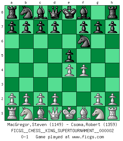 Last move : 0-1 2018 June 1 0:38:7 [Event "FICGS__CHESS__KING_SUPERTOURNAMENT__000002"] [Site "FICGS"] [Date "2018.05.01"] [Round "1"] [White "MacGregor,Steven"] [Black "Csoma,Robert"] [Result "0-1"] [WhiteElo "1149"] [BlackElo "1359"] 1.e4 e5 2.f4 Nf6 0-1 This chess game has been lost on time (started : 2018.05.01 22:10:15) KGD : 2...Nf6 Player Black won this chess game. Follow this game move after move (download)Bobby just drops the pieces and they fall on the right squares. (Miguel Najdorf) Frage: Was machen Sie mit den Preisen? Anwort: Ich habe Angst, dass meine Freundin davon neue Kleider kauft. (Loek van Wely) Aunque la mayoría de la gente disfruta observar las partidas de los grandes Maestros de ataque, algunos de los jugadores mas notables en la historia han sido los jugadores silenciosos posicionales. Lentamente ellos te aplastan despojandote de tu espacio, congestionando tus piezas y dejandote virtualmente sin nada que hacer. (Yasser Seirawan) Les Echecs mettent en conflit, non pas deux intelligences, mais deux volontés. (Lasker) Treat your password like your toothbrush. Don't let anybody else use it, and get a new one every six months. (Clifford Stoll)