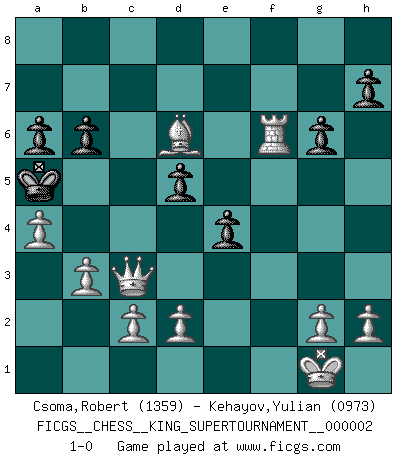 Last move : 1-0 2018 May 24 23:0:27 [Event "FICGS__CHESS__KING_SUPERTOURNAMENT__000002"] [Site "FICGS"] [Date "2018.05.01"] [Round "1"] [White "Csoma,Robert"] [Black "Kehayov,Yulian"] [Result "1-0"] [WhiteElo "1359"] [BlackElo "0973"] 1.e4 e5 2.f4 d5 3.Nf3 dxe4 4.Nxe5 Bd6 5.Bc4 Bxe5 6.fxe5 Nc6 7.O-O Be6 8.Bxe6 fxe6 9.Qh5+ g6 10.Qg4 Qd5 11.Nc3 Nxe5 12.Nxd5 exd5 13.Qe6+ Ne7 14.Qxe5 O-O-O 15.Qxe7 Rde8 16.Qa3 a6 17.b3 Re6 18.Bb2 Rhe8 19.Bd4 Rg8 20.Rf8+ Rxf8 21.Qxf8+ Kd7 22.Rf1 Re7 23.Bc5 b6 24.Qxe7+ Kc6 25.Rf6+ Kb7 26.Bd6 Kc6 27.Qxc7+ Kb5 28.a4+ Ka5 29.Qc3+ 1-0 KGD : Falkbeer, Tartakower variation Kingside Castling by player White (move 7) Queenside Castling by player Black (move 14) Player White won this chess game. Follow this game move after move (download)Robert Fischer is a law unto himself. (Larry Evans) Strategie ist, wie man ein Mädchen auf den Rücksitz bekommt. Taktik ist, was man tut, wenn man dann dort ist. (Anonymous) El poder defensivo de una pieza clavada, solamente es imaginario. (Aaron Nimzovich) Les ravages du H expliquent la différence de niveau entre Tal et Thal [Abergel]. You know what they say : You lie down with the Devil, you wake up in Hell. (Horatio Caine, C.S.I. Miami)