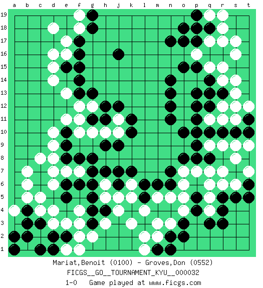 Last move : 1-0 2007 December 9 6:1:55 [Event "FICGS__GO__TOURNAMENT_KYU__000032"] [Site "FICGS"] [Date "2007.05.04"] [Round "1"] [Black "Mariat,Benoit"] [White "Groves,Don"] [Result "1-0"] [Rating 1 "0100"] [Rating 2 "0552"] 1.q16 d16 2.q3 d4 3.f17 e17 4.f16 d14 5.j16 q5 6.r5 r6 7.r4 q7 8.o3 k3 9.q10 r9 10.r10 s9 11.k10 d10 12.c6 c8 13.e6 f4 14.c3 c4 15.b4 b5 16.b3 c5 17.e2 r14 18.n17 r17 19.r16 q17 20.p17 p18 21.o17 p14 22.o10 s11 23.n14 s17 24.o18 s16 25.q18 b6 26.c7 b7 27.f13 f11 28.g11 g10 29.h11 h10 30.h7 o5 31.n6 n5 32.m6 m5 33.l6 k5 34.o8 k6 35.k7 d3 36.d2 f3 37.g5 h6 38.g6 h5 39.g7 d6 40.d7 e7 41.e8 f7 42.f8 d8 43.f6 d7 44.e10 f10 45.e9 e11 46.j9 e13 47.f14 n3 48.n2 m3 49.q12 o13 50.n13 o12 51.n12 o11 52.n11 q11 53.p11 r11 54.p13 o14 55.p12 r15 56.p15 f2 57.q14 q15 58.o15 p16 59.g4 m2 60.o2 r18 61.p19 j10 62.k11 j11 63.j12 g12 64.h12 f12 65.g13 h3 66.h9 e1 67.c1 d9 68.g8 f18 69.g18 f19 70.g19 d18 71.s5 s6 72.e15 d15 73.r13 s13 74.s10 q9 75.t11 s12 76.p9 o7 77.n7 o6 78.t6 t7 79.t5 r12 80.q13 t12 81.t10 t9 82.p10 s14 83.s7 r7 84.q8 p7 85.p8 s8 86.p4 q4 87.p5 q6 88.r3 o4 89.g3 g2 90.h4 j4 91.m1 l2 92.j6 j5 93.j7 a4 94.a2 b1 95.b2 f1 96.d1 e3 97.a1 l1 98.n1 r19 99.l5 l4 100.e5 q19 101.p18 e16 102.f15 1-0 Here are the names of the openings (joseki) played in the four corners : Corner d16 : d16 f17 Hoshi (Hwajeom, Seongjeom, Xingwei`) 4-4 Point. The star or hoshi (4-4) point, emphasizing influence at the potential expense of territory. Ikken Kakari (Hankan Keolch'im, Yi Gua`jiao~, 1-Space Low Approach). Black 2 is the standard approach move to the 4-4. Corner q4 : q3 q5 Komoku (Somok, Xiao~mu`) 3-4 Point. The komoku (3-4) point is the traditional corner enclosure move.. Ikken Takagakari (Hankan Nop'dakeolch'im, Yi Gaogua`jiao~, 1-Space High Approach). The 5-4 approach move has become more popular in modern times, as modern Go emphasizes speed and influence. Corner d4 : d4 c6 Hoshi (Hwajeom, Seongjeom, Xingwei`) 4-4 Point. The star or hoshi (4-4) point, emphasizing influence at the potential expense of territory. Ikken Kakari (Hankan Keolch'im, Yi Gua`jiao~, 1-Space Low Approach). Black 2 is the standard approach move to the 4-4. Corner q16 : q16 r14 Hoshi (Hwajeom, Seongjeom, Xingwei`) 4-4 Point. The star or hoshi (4-4) point, emphasizing influence at the potential expense of territory. Ikken Kakari (Hankan Keolch'im, Yi Gua`jiao~, 1-Space Low Approach). White 2 is the standard approach move to the 4-4. Player Black won this Go (weiqi, baduk) game. Follow this game move after move (download)You can hide nothing on the goban. (Pierre Audouard) It is the aim of the modern school, not to treat every position according to one general law, but according to the principle inherent in the position. (Richard Reti)