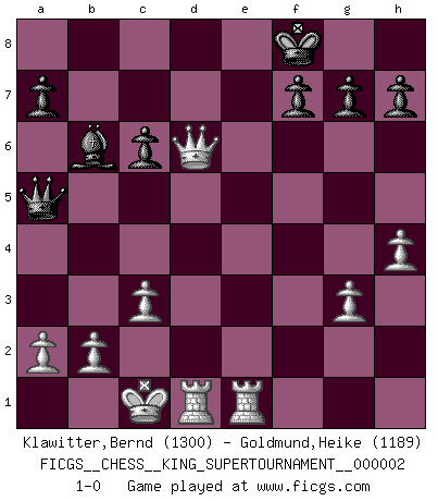 Last move : 1-0 2018 May 27 12:16:51 [Event "FICGS__CHESS__KING_SUPERTOURNAMENT__000002"] [Site "FICGS"] [Date "2018.05.01"] [Round "1"] [White "Klawitter,Bernd"] [Black "Goldmund,Heike"] [Result "1-0"] [WhiteElo "1300"] [BlackElo "1189"] 1.e4 e5 2.f4 exf4 3.Nf3 Nc6 4.Bc4 Nf6 5.e5 Ne4 6.h4 Bc5 7.d4 Bb6 8.c3 O-O 9.Bxf4 d6 10.Nbd2 Nxd2 11.Qxd2 Be6 12.O-O-O Qe7 13.exd6 cxd6 14.d5 Bxd5 15.Bxd5 Rac8 16.Bxc6 Rxc6 17.Rhe1 Qd7 18.Ne5 Qf5 19.Nxc6 bxc6 20.g3 Qc5 21.Bxd6 Qa5 22.Bxf8 Kxf8 23.Qd6+ 1-0 King's knight's gambit Kingside Castling by player Black (move 8) Queenside Castling by player White (move 12) Player White won this chess game. Follow this game move after move (download)The passion for playing Chess is one of the most unaccountable in the world. (H.G. Wells) Ein Gewinn durch eine ungenaue Kombination, sei sie auch noch so vorzeigbar, erfüllt mich mit Schaudern. (Wilhelm Steinitz) Evita las multitudes. Haz independientemente tu propio razonamiento. Trata de ser el jugador de Ajedrez, no la pieza de Ajedrez. (Ralph Charell) Celui qui prend des risques peut perdre, celui qui n'en prend pas perd toujours. (Xavier Tartacover) It is a good thing for an uneducated man to read books of quotations. (Winston Churchill)