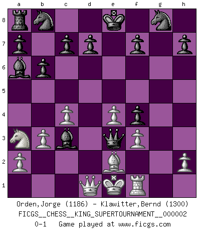 Last move : 0-1 2018 May 23 0:37:50 [Event "FICGS__CHESS__KING_SUPERTOURNAMENT__000002"] [Site "FICGS"] [Date "2018.05.01"] [Round "1"] [White "Orden,Jorge"] [Black "Klawitter,Bernd"] [Result "0-1"] [WhiteElo "1186"] [BlackElo "1300"] 1.e4 e5 2.f4 exf4 3.Nf3 g5 4.b3 g4 5.Bb2 gxf3 6.gxf3 Qh4+ 7.Ke2 b6 8.Bxh8 Bc5 9.d4 Ba6+ 10.Kd2 Qf2+ 11.Be2 Bxd4 12.Rf1 Qe3+ 13.Ke1 Bxh8 14.c4 Bxa1 15.Na3 Bc3+ 0-1 King's knight's gambit Player Black won this chess game. Follow this game move after move (download)Whoever sees no other aim in the game than that of giving checkmate to one's opponent will never become a good Chess player. (Euwe) Korrekt heißt in Deutschland die Haltung eines Mannes, dessen Benehmen nach dem Urteile seiner Nachbarn seiner Stellung angemessen ist. Um korrekt zu sein, muß man sich der Meinung der anderen anpassen... (Emanuel Lasker) No es tiempo de jugar al Ajedrez cuando la casa esta en llamas. (Proverbio Italiano) Des idées, des idées, j'en ai cent, j'en ai mille. Des bonnes, des mauvaises, applicables, irréalisables... Il suffit de faire le tri ! (Roos) Nothing is more important for teaching us to understand the concepts we have than constructing fictitious ones. (Ludwig Wittgenstein)
