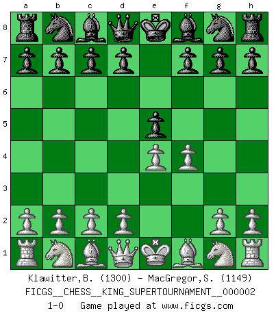 Last move : 1-0 2018 June 1 0:38:7 [Event "FICGS__CHESS__KING_SUPERTOURNAMENT__000002"] [Site "FICGS"] [Date "2018.05.01"] [Round "1"] [White "Klawitter,Bernd"] [Black "MacGregor,Steven"] [Result "1-0"] [WhiteElo "1300"] [BlackElo "1149"] 1.e4 e5 2.f4 1-0 This chess game has been lost on time (started : 2018.05.01 22:10:15) King's gambit Player White won this chess game. Follow this game move after move (download)I play correspondence chess because it is both art and science while chess is art only. (A player at FICGS) Ich würde die 30 stärksten Spieler der USA im Simultanspiel besiegen. (José Raúl Capablanca) Yo adoro todas la posiciones. Denme una partida posicional difícil, y la jugaré. Pero posiciones totalmente ganadas, no las tolero. (Hein Donner) Le temps de noter son nom sur la feuille de partie, j'étais déjà en zeitnot ! D'un modeste amateur apparié lors de la première ronde d'un open contre le grand-maître Azmaïparashvili. Establishing goals is all right if you don't let them deprive you of interesting detours. (Doug Larson)