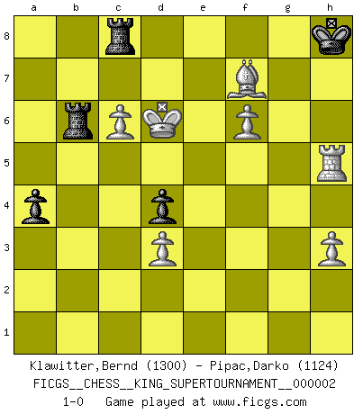 Last move : 1-0 2018 June 30 15:20:9 [Event "FICGS__CHESS__KING_SUPERTOURNAMENT__000002"] [Site "FICGS"] [Date "2018.05.01"] [Round "1"] [White "Klawitter,Bernd"] [Black "Pipac,Darko"] [Result "1-0"] [WhiteElo "1300"] [BlackElo "1124"] 1.e4 e5 2.f4 d6 3.Nf3 Bg4 4.f5 Nf6 5.d3 Nc6 6.c3 g6 7.h3 Bxf3 8.Qxf3 d5 9.g4 d4 10.Bg5 Qd6 11.Bxf6 Qxf6 12.a3 Na5 13.b4 Nb3 14.Ra2 Bh6 15.Qd1 Qh4+ 16.Ke2 Qg3 17.Qxb3 Qe3+ 18.Kd1 Qf3+ 19.Ke1 Qxh1 20.Qa4+ c6 21.Qd1 Be3 22.c4 f6 23.Qe2 gxf5 24.exf5 O-O-O 25.Nd2 Rdg8 26.Ne4 Rf8 27.Qg2 Qxg2 28.Bxg2 h5 29.Bf3 hxg4 30.Bxg4 Kc7 31.a4 b6 32.a5 Rh7 33.axb6+ Kxb6 34.c5+ Kb7 35.Nd6+ Kb8 36.Ke2 Re7 37.Kf3 Rd8 38.Ke4 Bg5 39.Ra6 Rc7 40.Nc4 Kc8 41.Nd6+ Kd7 42.Nf7 Rb8 43.Nxg5 fxg5 44.f6 Ke8 45.Kxe5 Kf7 46.Bh5+ Kf8 47.Kd6 Rcb7 48.Rxc6 Rxb4 49.Rc7 a5 50.Rh7 Kg8 51.Rg7+ Kh8 52.c6 R4b6 53.Rxg5 a4 54.Bf7 Rc8 55.Rh5+ 1-0 King's gambit Queenside Castling by player Black (move 24) Player White won this chess game. Follow this game move after move (download)There are tough players and nice guys, and I'm a tough player. (Bobby Fischer) Der beste Spieler in einem Turnier gewinnt es nie. Er landet auf Platz zwei oder drei. (Siegbert Tarrasch) Buenas posiciones no logran ganar juegos, buenas movidas sí. (Gerald Abrahams) J'ai toujours senti une vague pitié pour l'homme qui ne connaît rien aux échecs, tout comme j'en aurais pour un homme ignorant de l'amour. Les Echecs, comme la musique ou comme l'amour, ont le pouvoir de rendre heureux. (Siegbert Tarrasch) There are lots of people who mistake their imagination for their memory. (Josh Bilings)