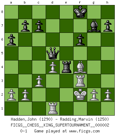 Last move : 0-1 2018 July 17 9:11:55 [Event "FICGS__CHESS__KING_SUPERTOURNAMENT__000002"] [Site "FICGS"] [Date "2018.05.01"] [Round "1"] [White "Hadden,John"] [Black "Radding,Marvin"] [Result "0-1"] [WhiteElo "1290"] [BlackElo "1250"] 1.e4 e5 2.f4 exf4 3.Nf3 d6 4.d4 g5 5.Nc3 Nc6 6.Bb5 Bd7 7.Bd2 Bg4 8.O-O Nge7 9.Nxg5 Bxd1 10.Raxd1 a6 11.Bc4 d5 12.Bxd5 Nxd5 13.Nxd5 Bg7 14.c3 O-O 15.Bxf4 Rc8 16.Rf3 f6 17.Ne6 Qd7 18.Nxf8 Kxf8 19.Ne3 Re8 20.Nd5 Rxe4 21.Ne3 Ne7 22.Kf2 Nd5 23.Nxd5 Qxd5 0-1 KGA : Fischer defense Kingside Castling by player White (move 8) Kingside Castling by player Black (move 14) Player Black won this chess game. Follow this game move after move (download)A Chess game is a dialogue, a conversation between a player and his opponent. Each move by the opponent may contain threats or be a blunder, but a player cannot defend against threats or take advantage of blunders if he does not first ask himself: What is my opponent planning after each move ? (Bruce A. Moon) Ich bin der einzige Schachspieler, der sich während der Vorbereitungen zum Turnier verletzt hat. (Woody Allen) El Ajedrez es el juego mas altamente simbólico, pero las agresiones estan por lo tanto aún mas francamente representadas en la partida. Tal vez comenzo como un juego de guerra; Algo como la representación de una batalla en miniatura entre las fuerzas de dos reinos. (Karl Meninger) Vous savez, camarade Pachman, je n'éprouve pas de plaisir à être ministre, je jouerais plutôt aux échecs comme vous, ou alors ferais une révolution au Venezuela. (Che Guevara à Ludek Pachman, 'Checkmate in Prague', 1975) The message for business people contemplating their place in the cyberspace is simple and direct: get linked or get lost. (Vic Sussman and Kenan Pollack)