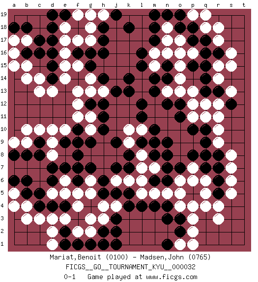 Last move : 0-1 2007 November 10 12:45:53 [Event "FICGS__GO__TOURNAMENT_KYU__000032"] [Site "FICGS"] [Date "2007.05.04"] [Round "1"] [Black "Mariat,Benoit"] [White "Madsen,John"] [Result "0-1"] [Rating 1 "0100"] [Rating 2 "0765"] 1.q16 d3 2.c16 q4 3.c5 d5 4.d6 e5 5.c4 c3 6.c8 e6 7.d7 e17 8.d17 e16 9.d15 c10 10.r6 c13 11.h16 f15 12.h14 f13 13.h12 o17 14.m17 o15 15.q14 r17 16.q17 q18 17.p18 r18 18.p17 s15 19.o3 r3 20.p5 s5 21.q10 m16 22.l16 m15 23.l15 l14 24.k14 l13 25.k13 g18 26.h18 g17 27.h17 n17 28.m18 p13 29.r13 q12 30.o11 r12 31.o18 n18 32.n19 s13 33.j3 g3 34.h5 l8 35.f10 g11 36.h11 g10 37.f8 f11 38.g9 l6 39.l4 l10 40.n8 m5 41.m4 p4 42.l12 o4 43.n4 o5 44.o16 n16 45.m14 p16 46.n14 o14 47.p6 n13 48.m13 o6 49.o7 s7 50.r7 s8 51.r8 r9 52.q9 r10 53.p15 o16 54.n12 o13 55.m10 h4 56.j5 j4 57.k4 h3 58.j2 b15 59.b16 b14 60.d16 b17 61.b18 a16 62.c17 a17 63.a18 a15 64.d18 e10 65.f9 p3 66.o2 p2 67.n3 g6 68.j7 m9 69.n9 j6 70.h6 k6 71.g7 g5 72.h10 m7 73.e9 d10 74.l11 k10 75.j9 b9 76.b8 b4 77.b5 b3 78.f1 f2 79.g1 h1 80.h2 g2 81.e1 d1 82.e2 e3 83.j1 d2 84.h1 a5 85.a6 a4 86.b6 o1 87.n1 p1 88.g16 e18 89.d19 h19 90.j19 g19 91.k18 e14 92.s12 r14 93.q13 r15 94.q15 p11 95.p10 q11 96.r5 s6 97.n6 n5 98.n7 q5 99.m6 l5 100.m8 l7 101.l9 k9 102.k8 m9 103.f16 e15 104.l9 q6 105.m9 p7 106.p8 r4 107.q8 g13 108.c9 a9 109.a8 b10 110.d14 d13 111.f6 f5 112.f7 h13 113.j13 g14 114.g15 f17 115.o12 p12 116.r16 s16 117.q7 p6 118.g12 f12 119.d4 p19 120.o19 q19 121.e4 f4 122.e7 d9 123.k7 d8 124.e19 f19 125.k5 c14 126.n15 r11 127.m19 pass 128.pass pass 0-1 Here are the names of the openings (joseki) played in the four corners : Corner d4 : d3 c5 Komoku (Somok, Xiao~mu`) 3-4 Point. The komoku (3-4) point is the traditional corner enclosure move.. Ikken Kakari (Hankan Keolch'im, Yi Gua`jiao~, 1-Space Low Pincer). The small knight move is the basic approach move to the 3-4 point stone. It has been continually used for over four centuries. There are limitless variations, with new moves constantly being discovered. Black 2 opens the door to a treaure store of joseki. Corner d16 : c16 e17 Komoku (Somok, Xiao~mu`) 3-4 Point. The komoku (3-4) point is the traditional corner enclosure move.. Ikken Kakari (Hankan Keolch'im, Yi Gua`jiao~, 1-Space Low Pincer). The small knight move is the basic approach move to the 3-4 point stone. It has been continually used for over four centuries. There are limitless variations, with new moves constantly being discovered. White 2 opens the door to a treaure store of joseki. Corner q4 : q4 r6 Hoshi (Hwajeom, Seongjeom, Xingwei`) 4-4 Point. The star or hoshi (4-4) point, emphasizing influence at the potential expense of territory. Ikken Kakari (Hankan Keolch'im, Yi Gua`jiao~, 1-Space Low Approach). Black 2 is the standard approach move to the 4-4. Corner q16 : q16 o17 Hoshi (Hwajeom, Seongjeom, Xingwei`) 4-4 Point. The star or hoshi (4-4) point, emphasizing influence at the potential expense of territory. Ikken Kakari (Hankan Keolch'im, Yi Gua`jiao~, 1-Space Low Approach). White 2 is the standard approach move to the 4-4. Player White won this Go (weiqi, baduk) game. Follow this game move after move (download)Don't count territory held by only one eye. (Anonymous) Hold em is to stud what chess is to checkers. (Johnny Moss)